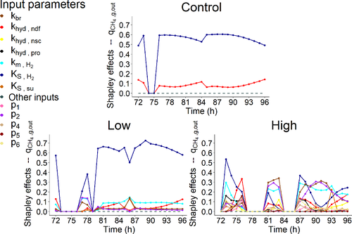 Get full text PDFRuminants play an important role in global warming by emitting enteric methane (CH4) through the degradation of feeds by the rumen microbiota. To better understand the dynamics fermentation outputs, including CH4 and volatile fatty acids (VFA) production, mathematical models have been developed. Sensitivity analysis (SA) methods quantify the contribution of model input parameters (IP) to the variation of an output variable of interest. In animal science, SA are usually conducted in static condition. In this work, we hypothesized that including the dynamic aspect of the rumen fermentation to SA can be useful to inform on optimal experimental conditions aimed at quantifying the key mechanisms driving CH4 and VFA production. Accordingly, the objective of this work was to conduct a dynamic SA of a rumen fermentation model under in vitro continuous conditions (close to the real in vivo conditions). Our model case study integrates the effect of the macroalgae Asparagopsis taxiformis (AT) on the fermentation. AT has been identified as a potent CH4 inhibitor via the presence of bromoform, an anti-methanogenic compound. We computed Shapley effects over time for quantifying the contribution of 16 IPs to CH4 (mol/h) and VFA (mol/l) variation. Shapley effects integrate the three contribution types of an IP to output variable variation (individual, via the interactions and via the dependence/correlation). We studied three diet scenarios accounting for several doses of AT relative to Dry Matter (DM): control (0% DM of AT), low treatment (LT: 0.25% DM of AT) and high treatment (HT: 0.50% DM of AT). Shapley effects revealed that hydrogen (H2) utilizers microbial group via its Monod H2 affinity constant highly contributed (> 50%) to CH4 variation with a constant dynamic over time for control and LT. A shift on the impact of microbial pathways driving CH4 variation was revealed for HT. IPs associated with the kinetic of bromoform utilization and with the factor modeling the direct effect of bromoform on methanogenesis were identified as influential on CH4 variation in the middle of fermentation. Whereas, VFA variation for the three diet scenarios was mainly explained by the kinetic of fibers degradation, showing a high constant contribution (> 30%) over time. The simulations computed for the SA were also used to analyze prediction uncertainty. It was related to the dynamic of dry matter intake (DMI, g/h), increasing during the high intake activity periods and decreasing when the intake activity was low. Moreover, CH4 (mol/h) simulations showed a larger variability than VFA simulations, suggesting that the reduction of the uncertainty of IPs describing the activity of the H2 utilizers microbial group is a promising lead to reduce the overall model uncertainty. Our results highlighted the dynamic nature of the influence of metabolic pathways on CH4 productions under an anti-methanogenic treatment. SA tools can be further exploited to design optimal experiments studying rumen fermentation and CH4 mitigation strategies. These optimal experiments would be useful to build robust models that can guide the development of sustainable nutrition strategies.