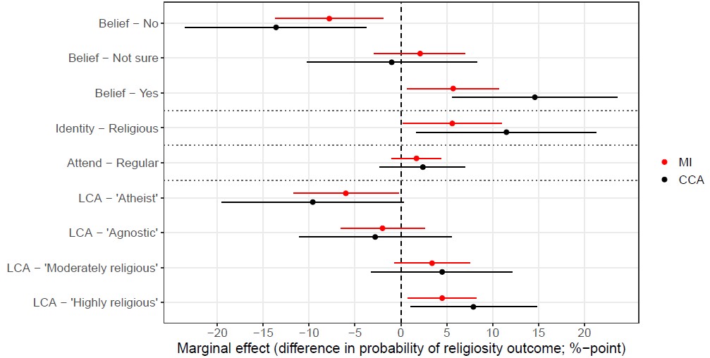 Get full text PDFBackground: Psychotic experiences (PEs) are common in the general population, and can be an early sign of psychotic disorders, which can have a large impact on people’s lives. Understanding the causes and consequences of PEs is therefore important, both for identifying potential causal risk factors for PEs and for exploring how PEs may subsequently affect people’s beliefs and behaviours. To investigate this, we focus on potential bidirectional causality between PEs and religiosity – a topic which remains under-researched and currently with a weak evidence base – using large-scale data from a UK longitudinal birth cohort. Methods: We used data from the Avon Longitudinal Study of Parents and Children (ALSPAC). PEs were assessed using semi-structured interviews at age 24 (for PEs since age 12) and self-reported questionnaires at age 32 (for PEs in the past year). Religiosity was self-reported at age 28, and included questions on religious beliefs, identity and service attendance. Multivariable regression models, adjusted for relevant confounders, analysed bidirectional associations between PEs and religiosity (i.e., whether PEs from age 12-24 potentially cause religiosity at age 28, and whether religiosity at age 28 potentially causes PEs at age 32). Multiple imputation was used to impute missing data and boost statistical power, with g-computation used to calculate our marginal causal contrasts of interest. Results: Interview-rated PEs between age 12-24 were associated with a greater probability of religious belief; participants with PEs were 7.8%-points (95% confidence/compatibility interval [CI] = 1.9% to 13.7%) less likely to answer ‘no’ to believing in God, and 5.7%-points (95% CI = 0.7% to 10.7%) more likely to answer ‘yes’. Similar patterns were observed for religious identity (PEs associated with a 5.6%-point [95% CI = 0.2% to 11.0%] increase in identifying as religious), but with weaker evidence of an association with religious service attendance (PEs associated with a 1.7%-point [95% CI = -1.0% to 4.4%] increase in regular attendance). Religious belief at age 28 was also associated with an increased probability of self-reported PEs at age 32 (5.7%-points [95% CI = 1.8% to 9.5%]), with effects for religious identity (2.1%-points [95% CI = -0.9% to 5.0%] increase in PEs) and religious attendance (5.6%-point [95% CI = -1.8% to 12.9%] increase in PEs) in the same direction but weaker and/or plausibly null. Conclusion: To the extent these results can be given a causal interpretation, these findings suggest a potential bidirectional causal relationship between PEs and religiosity, especially regarding religious beliefs. Further research is needed to explore whether these results are replicable and generalisable across populations, in addition to whether religiosity may moderate or mediate the long-term impact of PEs on mental health outcomes.