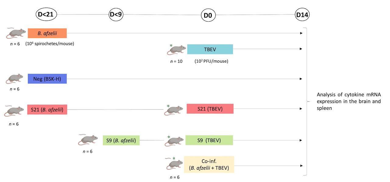 Get full text PDFTicks are important vectors responsible for transmitting a wide range of diseases that have significant impacts on both human and animal health. In Europe, the Ixodes tick is especially remarkable for its ability to spread pathogens such as Borrelia, the bacterium that causes Lyme disease, and the tick-borne encephalitis virus (TBEV), which can lead to serious neurological infections. Building on the results of our previous research involving co-infection with Borrelia afzelii and TBEV in C3H mice, this study aimed to further investigate the interactions between these two pathogens, focusing on the timing of infection and examining mRNA cytokine levels in the brain and spleen of both single- and co-infected mice and their possible link to the clinical outcome. The results revealed that the timing of infection significantly influenced the immune response, highlighting the complex interactions between B. afzelii and TBEV. B. afzelii infection can influence TBEV dynamics, either amplifying or suppressing its effects depending on the timing of infection. In addition, this study helps to better understand how the immune system reacts when both TBEV and B. afzelii infect a host under different conditions. It sheds light on how these pathogens interact and affect disease progression.