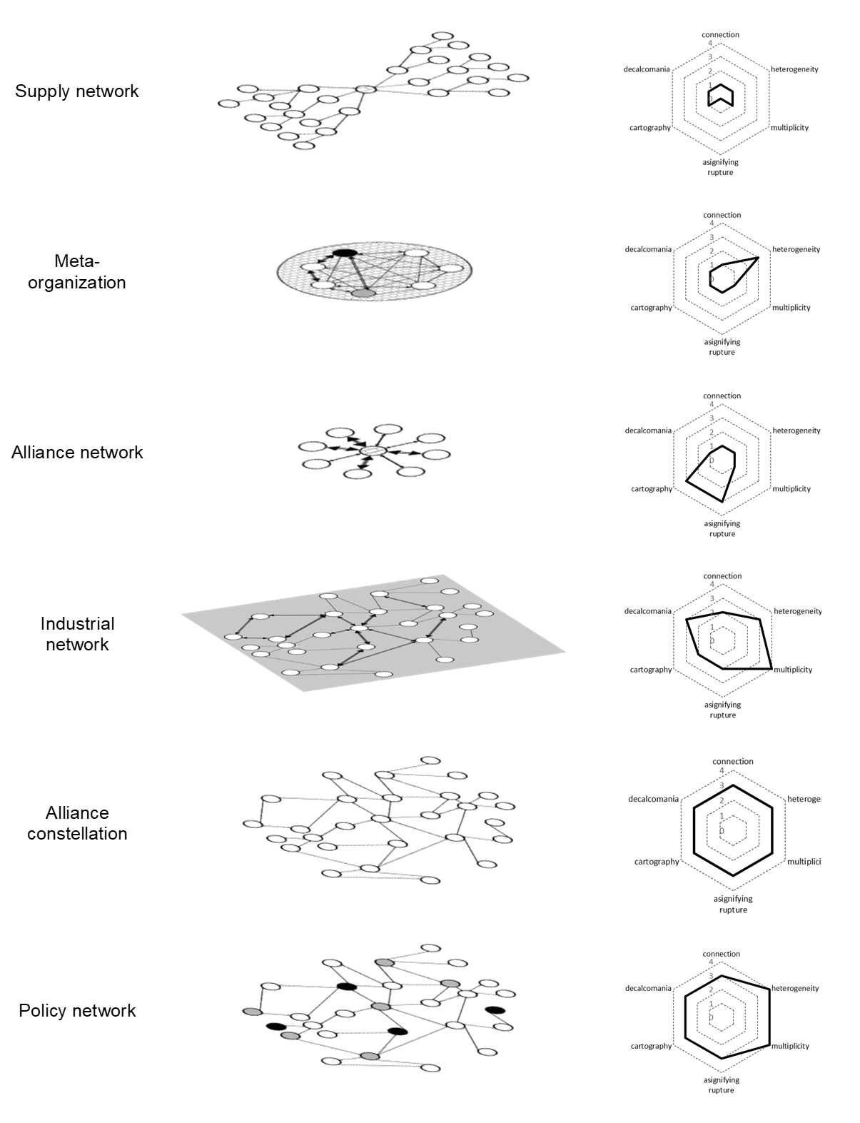 Get full text PDFCollaborations among organizations may happen through a variety of inter-organizational arrangements, such as alliances, supply networks, industrial districts, policy networks or meta-organizations. We join recent efforts in analysing this plurality and diversity of organizations by drawing on the concept of rhizome to study inter-organizational arrangements. We aim to provide tools which can help analysis, comparison and cumulating knowledge about inter-organizational collaborations by moving beyond categories (which are often specific to one field, theory, sector, and so forth). To do so, we build on Deleuze and Guattari’s concept of rhizome and develop an analytical rhizomatic framework focusing on connections among members, heterogeneity of members, multiplicity of interactions and connections, asignifying rupture in the connections, cartography of interactions, and decalcomania in the adoption of knowledge. On this basis, we develop an inter-organizational web approach of collaborations among organizations and outline possible applications and research venues.