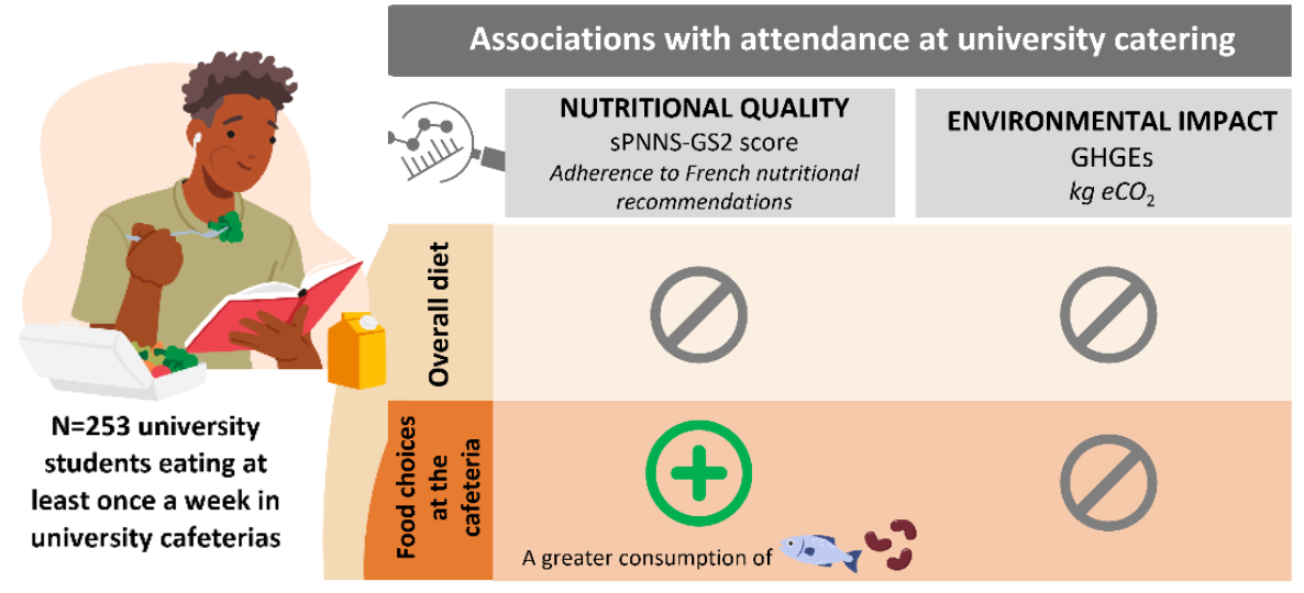 Get full text PDFAs public institutions, French university cafeterias have the potential to favour student well-being and academic performance by offering affordable, high-quality meals. More than half of the student population ate in these facilities at least once a week, with 17% eating there daily. However, limited data exists on students' actual food choices in this context. This study aimed to investigate the role of university catering in student diets, focusing on nutritional quality and environmental impact. Two hundred and fifty-three students were recruited using a non-probability quotas-based sampling method at the entrance of a large university cafeteria in Dijon during autumn 2023. Participants were 56% women and 20.2 (2.6) years old on average; they ate at this cafeteria at least once a week. They were asked to take pictures of their meal tray each time they ate at this cafeteria during three months. They also completed online questionnaires assessing their sociodemographic characteristics, overall diet using a 125-item food frequency questionnaire and attendance at university catering. The nutritional quality and environmental impact of students' food choices at the university cafeteria and of their overall diets were assessed as adherence to French recommendations, sPNNS-GS2 score, and greenhouse gas emissions, kg eCO2 and calculated for a standard 2000 kcal intake. The results indicated significant potential for improving the nutritional quality and environmental impact of both the students' food choices at the university cafeteria and of their overall diets. While frequent attendance at university catering was associated with healthier food choices (β=0.15, p=0.027) this did not translate into a broader improvement in the overall nutritional quality of students' diets (β=0.09, p=0.222). No associations were found between attendance at university catering with neither environmental impact of food choices (β=0.03, p=0.170) nor of overall diets (β=0.05, p=0.291). These findings suggest that although university catering has the potential to promote healthier and more sustainable eating habits, its full potential has yet to be realised notably by increasing the availability of healthier and more environmentally-friendly options such as legume-based dishes.