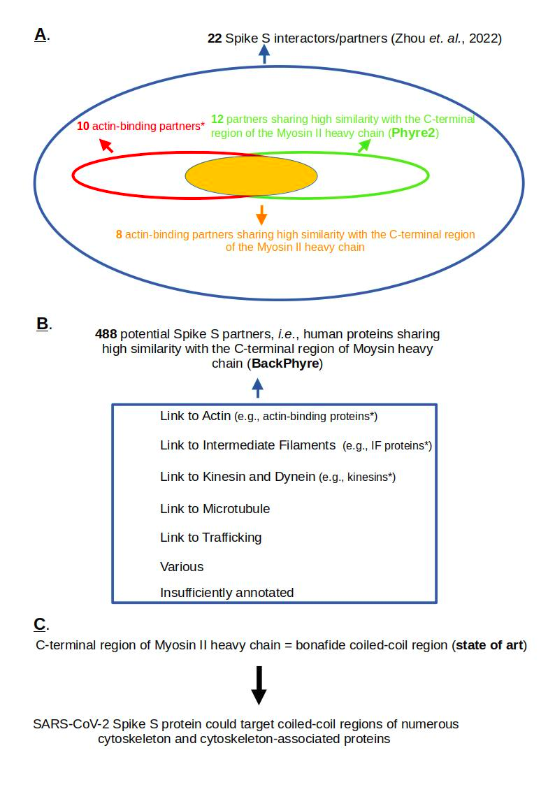 Get full text PDFUnderstanding the interactions between host and viral envelope proteins is essential to get insights into the dynamics of viral infection. To investigate more closely the mechanisms governing SARS-CoV-2 entry and intracellular trafficking, I reanalyzed the most extensive SARS-CoV-2–human protein–protein interactome dataset currently available. My investigation centered on the Spike S protein, a key player in initiating viral infection by binding to the host cell membrane receptor Angiotensin-Converting Enzyme 2 (ACE2). I first present evidence demonstrating the statistical overrepresentation of actin-binding proteins among the Spike S partners/interactors. Next, I show that a majority of these partners contains a structural domain sharing high similarity with the C-terminal region of the Myosin II heavy chain, Myosin II being known for its roles in muscle contraction and various cellular motility processes. I subsequently demonstrate that this domain is particularly prevalent in actin-binding proteins, intermediate filaments proteins and kinesins, which all are related to the cytoskeleton known to be involved in diverse cellular functions, including endocytosis and intracellular transport — processes crucial for viral infections. Finally, I highlight that the structural domain mentioned above is a bonafide coiled-coil region. I therefore conclude that Spike S might target proteins possessing such regions. Collectively, my findings suggest that the interactions between SARS-CoV-2 Spike S and human proteins, potentially mediated by coiled-coil regions, may have been underestimated. As this work relies on in silico evidence, direct biological extrapolations require caution.