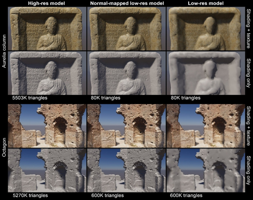 Get full text PDFA great challenge in 3D digitization and modelling lies in striking a balance between surface detail and model size, while accommodating the geometric information representation requirements of diverse archaeological practices. 3D meshes that contain a high polygon count severely impact storage requirements, data transmission, and 3D rendering. It is therefore typical for high-resolution digitized objects and modelled assets alike to be sub-sampled and simplified into levels of detail (LODs) to match the requirements of the intended applications. By doing so, however, geometric detail is lost, negatively affecting the model’s visual fidelity during 3D visualization. Normal mapping offers a reliable and practical solution to this challenge by transferring surface orientation data from the original, detailed models into simplified versions. This approach preserves the key visual characteristics present on the surface of a high-detail model, without reintroducing geometric complexity into the simplified structure. In archaeological contexts, where both accuracy and accessibility are important, normal mapping enables lightweight models to maintain the perceptual qualities of high-resolution originals, while supporting diverse visualization applications, from analytical inspection to public dissemination. In this paper, our proposed methodology explores the robustness of detail transfer through normal mapping on simplified archaeological models, highlighting its effectiveness as a tool for efficient cultural heritage visualization and immersive applications. The study claims that normal-mapped models can effectively stand in for the original high-detail scans in a variety of scenarios, thus offering a viable and efficient alternative to the demanding storage and transmission of high-fidelity 3D models.