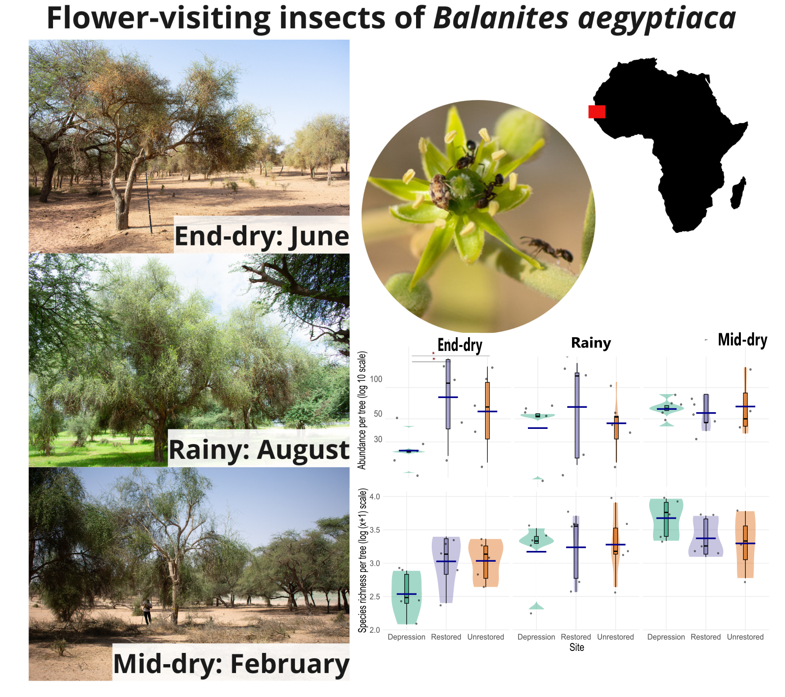 Get full text PDFInteractions between flowers and flower-visiting insects play central roles in ecosystem functioning. In addition to ensuring pollination, flower-visiting insects are also crucial for numerous other biotic interactions, using floral resources as fuel in their search for prey, hosts, breeding sites, and other resources. Studying insect-flower interactions may thus be strategic to conserve and restore biotic interactions in ecosystems heavily degraded by intensive land use and climate change, such as the arid savannas of the northern Sahel. We aimed to document for the first time the diversity of flower-visiting insects in this region and to examine whether restoration efforts of the Great Green Wall initiative have affected insect abundance and diversity. Using two capture methods, hand netting and pan traps, we inventoried insects visiting the flowers of Balanites aegyptiaca. This is the most abundant tree species in the region and is also of economic importance. We sampled three sites in a single locality: a “Restored” site from which livestock are excluded, an ”Unrestored” site in intensively grazed rangeland, and a topographical “Depression” site in a grazed area but with high tree density. Each site was sampled at three different periods to examine variation in this extremely harsh and seasonal environment. The open-access flowers of Balanites aegyptiaca are produced in multiple flowering events each year. We found a surprisingly high diversity of insects visiting its flowers, comprising 371 morphospecies from 10 insect orders, with a predominance of Hymenoptera and Diptera. Insect abundance, diversity, and species composition differed markedly between seasons. Bees appear to be important pollinators, particularly solitary bees of the family Halictidae, which were abundant in all seasons. Diptera, in particular several families of small flies, were also frequent visitors and were especially abundant and diverse in the wet season. Ants were especially abundant at flowers in the dry season, when few resources other than flowers and flower-visiting insects were likely available to them. Insect abundance and observed diversity differed only little between sites, but estimated total diversity (Chao1 richness) was highest in the Depression site. Insects visiting flowers of B. aegyptiaca included herbivores, decomposers, and parasitoids and predators of diverse arthropods, underlining the role of these floral resources in numerous facets of ecosystem functioning. The floral resources of B. aegyptiaca and other trees, which can flower throughout the year, are likely critical to ensure the persistence of numerous insect species. Integrating biotic interactions into ecosystem management is crucial for conservation and restoration in Sahelian ecosystems.