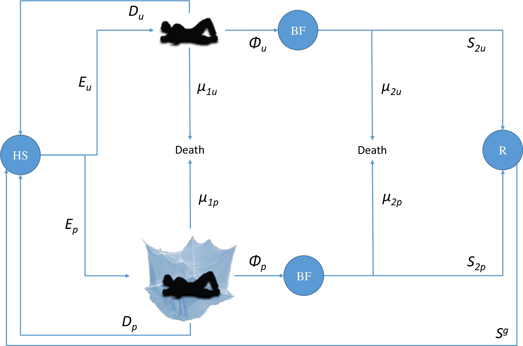Figure 1 - Anopheles Host-Seeking, Feeding, and Mortality (HSFM) model used to feed a malaria transmission model. Blue circles represent physiological states of Anopheles mosquitoes (HS: Host-seeking; BF: Blood-fed; R: Resting). An Anopheles vector looking for a blood-meal (in state Host-Seeking: HS) will either enter the room of an ITN-protected human (with probability Ep) or the room of an unprotected one (with probability Eu), depending on the remote effect of the ITN (attractive, inert or repulsive) and the human ITN usage rate in the community. After entering a hut, a vector will either be diverted (impaired and postponed to host-seeking the next night, with probability D) or attempt to feed, with two possible outcomes: feeding (with probability Φ1) or death (with probability µ1). Then, blood-fed (BF) vectors will either die due to post-bite mortality (µ2) or survive (S2), entering the Resting state (R). A vector that enters state R will complete its gonotrophic cycle (g) with probability Sg and enter state HS to begin a new cycle.