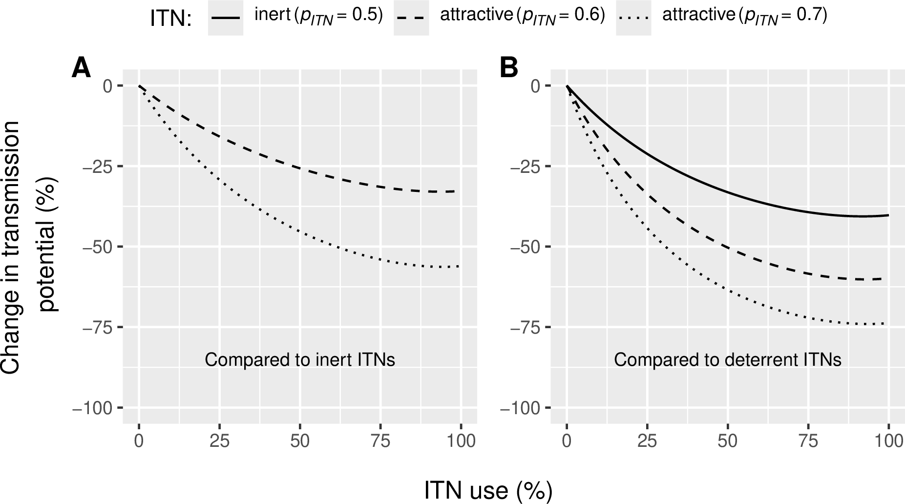 • if \(p_{ITN}\)< 0.5, the ITN is repulsive, i.e. it reduces host attraction,