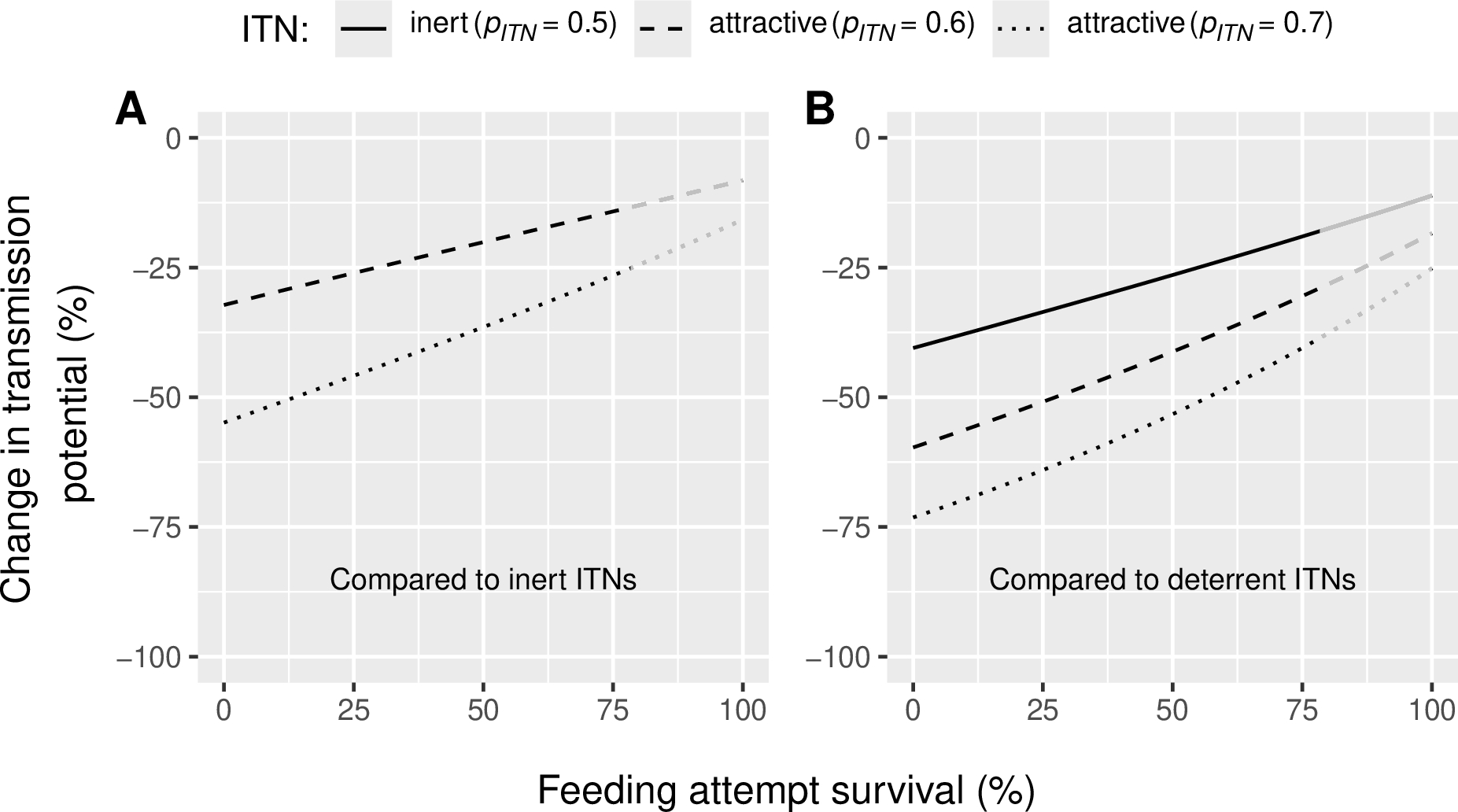 Figure 3 - Reduction in Plasmodium transmission potential (\(RedTP\)) induced (A) by attractive Insecticide-treated Nets (ITNs) compared to inert ones and (B) by attractive and inert ITNs compared to deterrent ITNs for varied levels of physiological resistance in the vector population (feeding attempt survival, \(1 - µ_{p1})\). Vector preference \(p_{ITN}\) of 0.6 indicates that 60% of malaria vectors choose an ITN-protected human if presented against an unprotected human. The reference inert ITN (panel A) induces a vector preference of 0.5 (vectors are equally likely to select an ITN-protected or unprotected human) and the reference deterrent ITN (panel B) induces a vector preference of 0.36 (only 36% of the vectors choose an ITN-protected human against an unprotected human). Lines become grey in the range [82; 100%], corresponding to survival levels that were never observed in Moiroux et al. (2017) (supplementary Figure 2).