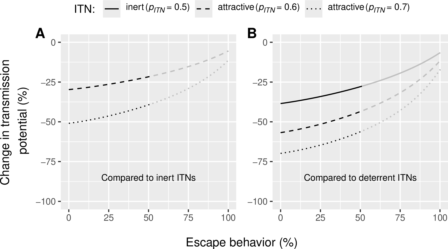 Figure 4 - Reduction in Plasmodium transmission potential (\(RedTP\)) induced (A) by attractive Insecticide-treated Nets (ITNs) when compared to inert ones and (B) by attractive and inert ITNs when compared to deterrent ITNs for varied levels of quantitative behavioral resistance (escape behavior expressed as percent diversion, \(D_{p}\)) in the vector population. Vector preference \(p_{ITN}\) of 0.6 indicates that 60% of malaria vectors choose an ITN-protected human if presented against an unprotected human. The reference inert ITN (panel A) induces a vector preference of 0.5 (vectors are equally likely to select an ITN-protected or unprotected human) and the reference deterrent ITN (panel B) induces a vector preference of 0.36 (only 36% of the vectors choose an ITN-protected human against an unprotected human). Lines become grey in the range [51; 100%], corresponding to diversion levels that were never observed in Moiroux et al. (2017) (supplementary Figure 2).