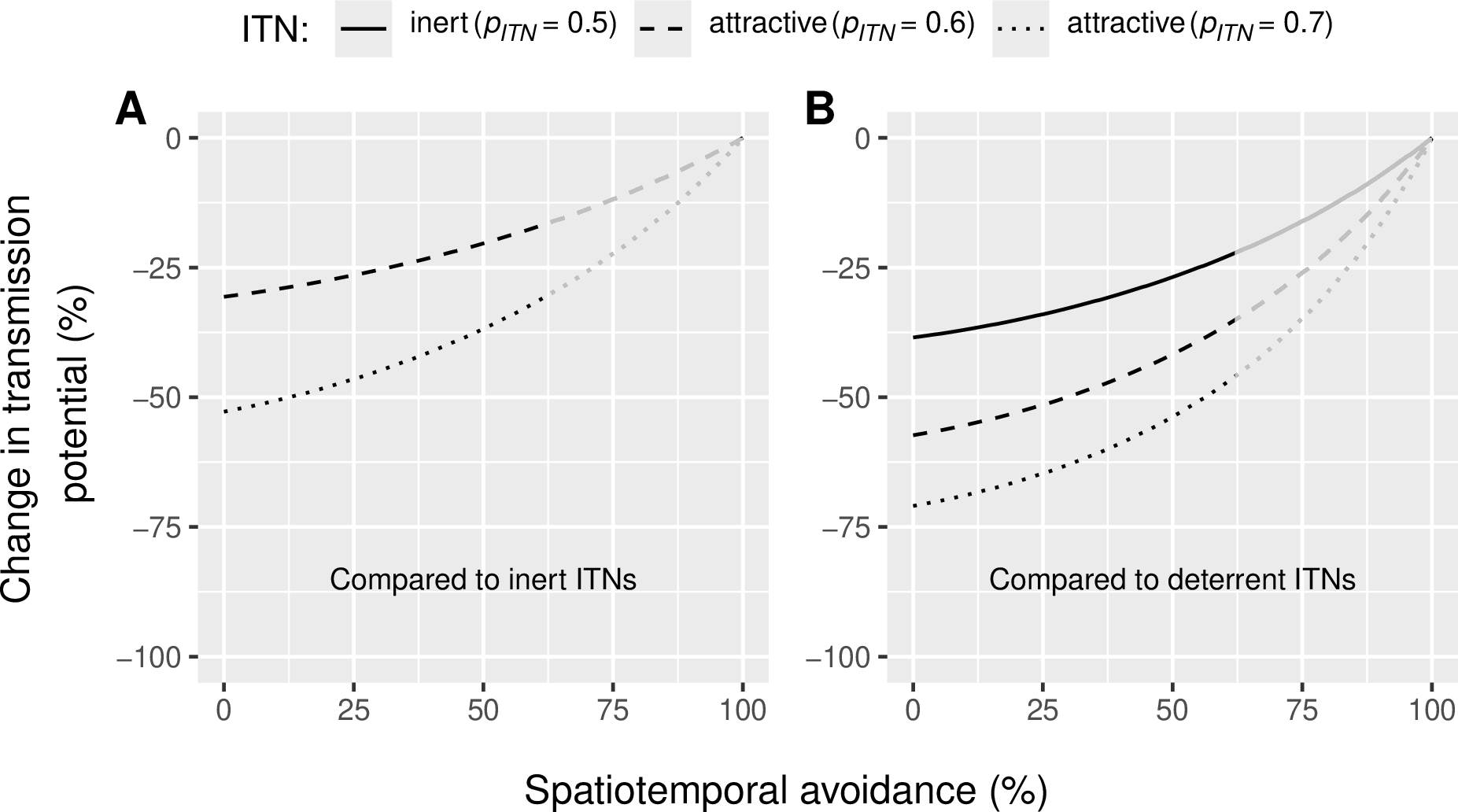 Figure 5 - Reduction in Plasmodium transmission potential (\(RedTP\)) induced (A) by attractive Insecticide-treated Nets (ITNs) when compared to inert ones and (B) by attractive and inert ITNs when compared to deterrent ITNs for varied levels of qualitative behavioral resistance (spatiotemporal avoidance expressed as 1 minus the efficacy of ITNs in reducing the number of bites, \(1 - \Pi\)) in the vector population. Vector preference \(p_{ITN}\) of 0.6 indicates that 60% of malaria vectors choose an ITN-protected human if presented against an unprotected human. The reference inert ITN (panel A) induces a vector preference of 0.5 (vectors are equally likely to select an ITN-protected or unprotected human) and the reference deterrent ITN (panel B) induces a vector preference of 0.36 (only 36% of the vectors choose an ITN-protected human against an unprotected human). Lines become grey in the range [62; 100%], corresponding to spatiotemporal avoidance levels that were never observed in the field (see refs for parameter \(\Pi\) in Table 1).