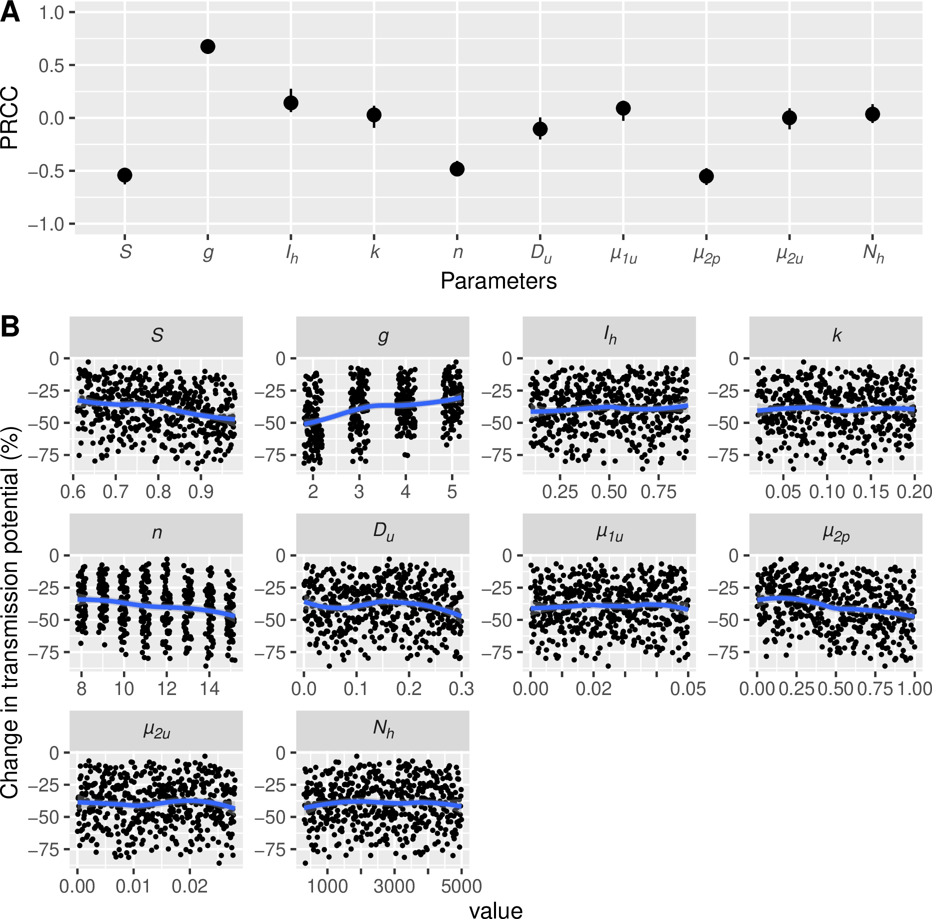 Figure 6 - Results of a sensitivity analysis using Latin Hypercube Sampling, showing (A) Partial Rank Coefficients of Correlation (PRCC) of parameters and (B) simulation plots illustrating the impact on transmission potential of varying parameter values when comparing a moderately attractive ITN (pITN = 0.6) to a deterrent ITN (pITN = 0.36). Intervals in panel A are 95% Confidence Interval of PRCC. In panel B, percent change in transmission potential (\(RedTP\)) is plotted against values for each model parameter (x-axis). Blue curves on panel B are loess regression. See Table 1 for parameters’ definitions.