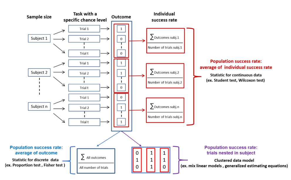 A classical design for these types of studies is depicted in Figure 1. Here, each subject in the sample must perform several trials (replications) of a task, in which they must select the correct answer from multiple choices. Here the probability of succeeding at the task by chance, defined as the chance level, is determined by the ratio of correct choices to incorrect ones. In this type of protocol, the experimenter can vary three different parameters: 1) the number ‘n’ of subjects performing the task, 2) the number ‘t’ of trials each subject performs, and 3) the chance level. Furthermore, three different analytical procedures can be applied to the data. The first involves calculating a global population success rate by dividing the total number of successes by the total number of trials. Alternatively, one can first calculate the success rate of each subject and then determine the average success rate of the population. Finally, a statistical model for clustered data can be used to account for the nested nature of the data, i.e., the repetition of trials within the same subject. In the first case, a statistical test for discrete values (e.g., a proportion test) is used. In the second case, a statistical test for continuous values is required (e.g., a Student’s t-test). In the third case, multilevel models or generalized estimating equations can be applied (Ballinger, 2004; Aarts et al., 2014; Olvera Astivia et al., 2019; McNabb & Murayama, 2021).