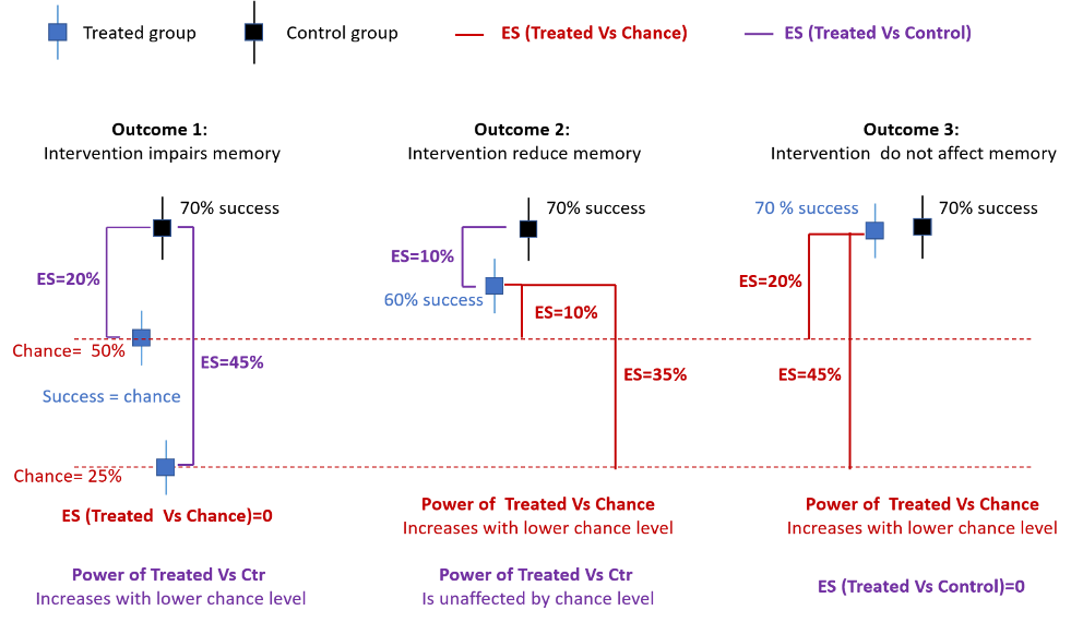 3.The intervention does not affect memory retrieval: In this scenario, the ES quantifying the difference between treaded and control group is zero and independent of chance level but again is important to verify that treated groups perform better than chance, and the statistical power of this compareson depend on the chose chance level (Figure 2, right).
