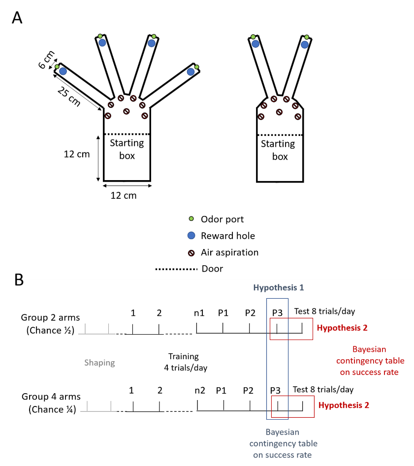 To assess the impact of modifying the chance level on animal performance, two groups of adult mice (six animals per group) participated in an associative olfactory task within a radial labyrinth, where they encountered either two arms (chance ½) or four arms (chance ¼). The mice underwent training until performance plateaued. The absence of differences in success rates between the two groups was evaluated using a Bayesian statistical test, calculating the probability of the null hypothesis over the alternative (BF01). The training session consisted of four trials, except for the last session where eight trials were used in order to evaluate the impact of altering the number of trials on success rates, (for further details, refer to the methods section and Figure 3).