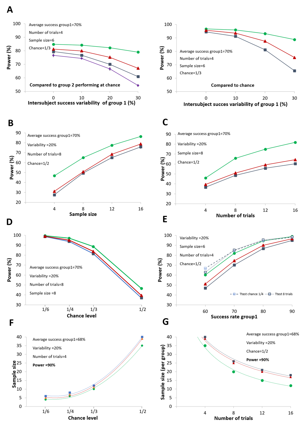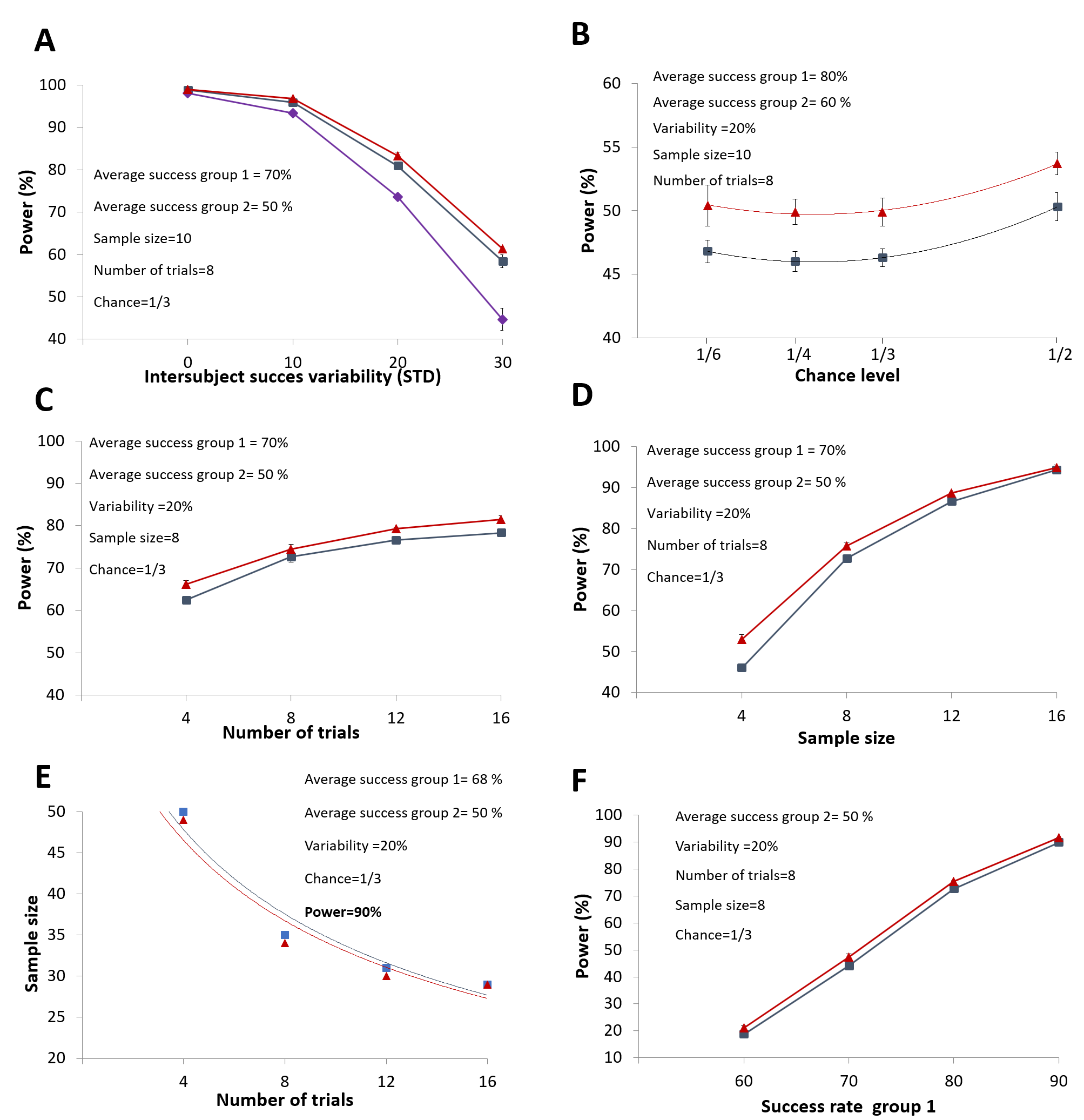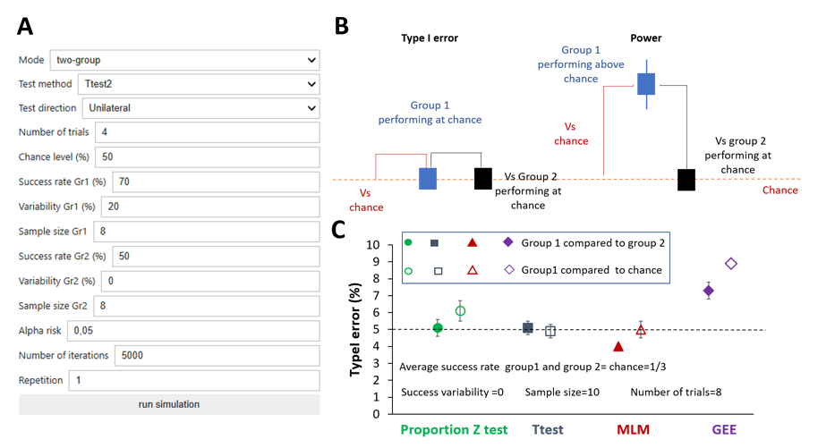 In order to determine the statistical power for studies that aim to evaluate success rates, we have developed, a power calculator based on Monte Carlo simulation freely available (Kuczewski & Garcia, 2025). Here a simple, notated interface allows users to define the different parameters of the experimental plan (Figure. 4A). We used SuccessRatePower to assess the impact of modifying the different parameters shown in Figure 1A on statistical power. Simulations were run under two conditions: in the first, the success rate of the experimental group was compared either to chance or to the performance of a second group performing at chance (Figure 4 and Figure 5). In the second, the comparison was made between two groups both performing above chance (Figure 6 and Figure 7).