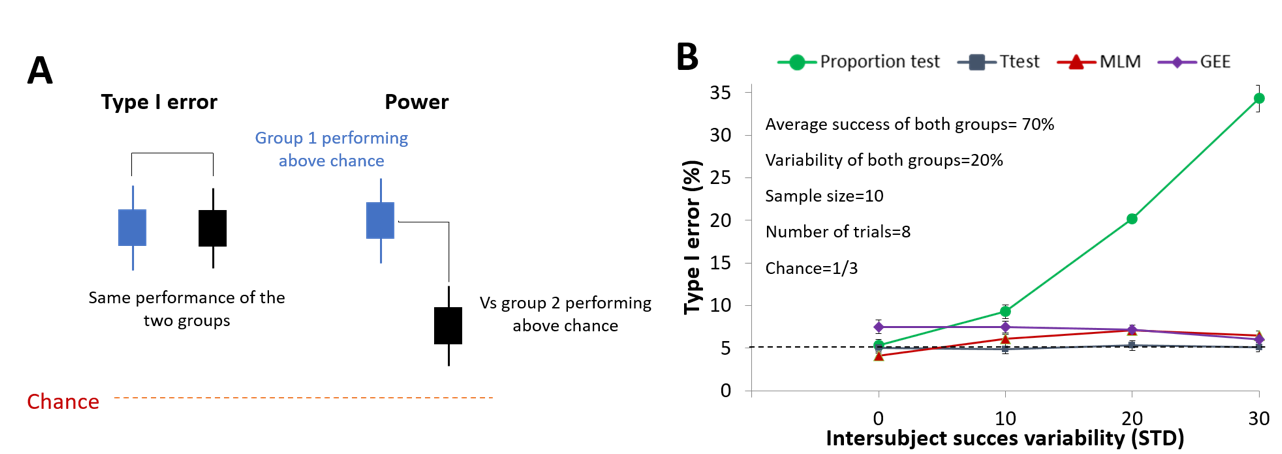Figure 6 - Type I error as a function of different experimental parameters when one group is compared to control group performing above chance level. (A) Graphical representation of the experimental configuration used for Type I error and power calculation. (B) Occurrence of Type I error as a function of the analytical procedure. Notably, when not visible the 95% confidence interval bars are smaller than the size of the markers. Data and script can be found online (Kuczewski, 2022a) MLM = Multilevel Mixed Model; GEE = Generalized Estimating Equations.