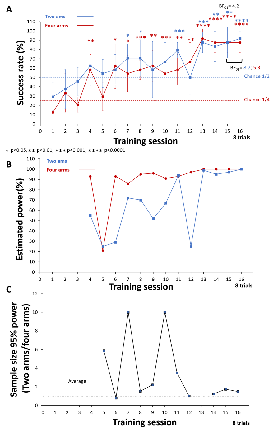 Both the behavioral protocol and analytical plan were pre-registered (Kuczewski, 2024a). Figure 8A illustrates that both groups displayed similar learning curves, with the ¼ chance level group reaching statistically significant effects earlier than the ½ chance level group. Additionally, both groups exhibited comparable performance at the plateau (87.5± 14% for ¼ chance level group, 87.5 ± 20% for ½ chance level group at training session 15; BF01=4.2, p=0.15 TOST test, n=6). Moreover, the success rate remained unaffected by doubling the number of trials performed by the mice during the eight-trial session (For two arms group: 87.5± 20% for 4 trials, 91.7 ± 10% for 8 trials; BF01=8.7, p=0.02 TOST test. For four arms group: 87.5± 14% for 4 trials 87.5± 14% for 8 trials BF01=5.3, p=0.06 TOST test, n=6).