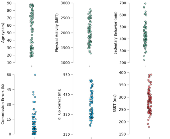 Seventy-eight individuals (40 women), aged 18 to 88 years old, participated in this study. Seventeen participants (9 women) were aged between 65 and 80 years old, and fourteen (7 women) were above 80 years old. We conducted multiple regression analyses to examine the predictive relationship between age, physical activity, and sedentary behavior on motor impulse control and reactive inhibitory control. This approach allowed us to determine the unique contribution of each predictor while controlling for potential confounding effects.
