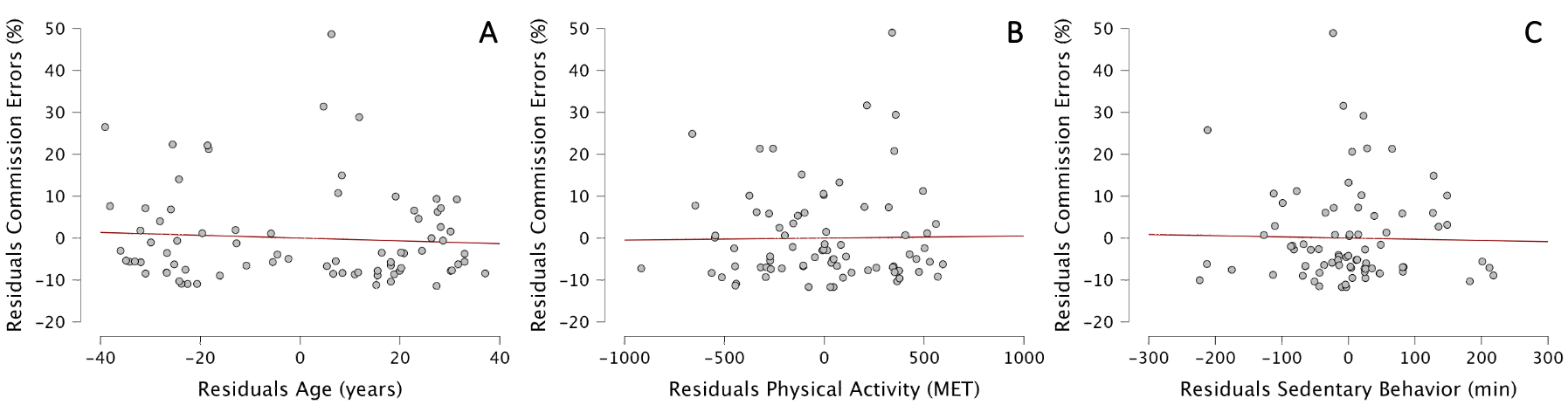 With a multiple regression, we first determined whether our 3 regressors (age, physical activity and sedentary behavior) explained the variability of the percentage of commission errors in the GNG task. The Durbin–Watson test yielded a statistic of 1.71, indicating no significant autocorrelation in the residuals of the regression model. All predictors had VIF values between 1.02 and 1.19, suggesting an absence of multicollinearity. The ANOVA showed that our model did not better predict the percentage of commission errors than the mean model (F(3,74)=0.162, p<0.921, with adjusted R2 of 0.034). This means that none of the 3 regressors could explain the variability of %commission errors in our sample (Figure 2).
