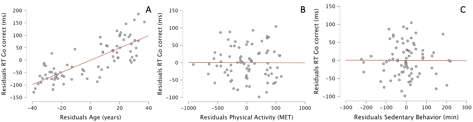 Figure 3 - Partial regression plots between residuals of RT of correct Go trials and residuals of Age (A), Physical Activity (B), and Sedentary behavior (C).
