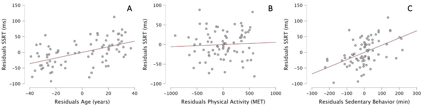 Figure 4 - Partial regression plots between residuals of SSRT and residuals of Age (A), Physical Activity (B), and Sedentary behavior (C).