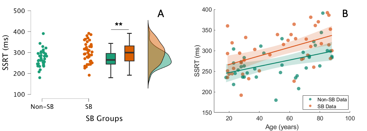 Figure 5 - A. Reactive inhibition and sedentary behavior. The mean SSRT of individuals with non-sedentary behavior (Non-SB, 271 ±40 ms) is significantly lower than that of individuals with sedentary behavior (SB, 300 ±49 ms). B. Correlation between age and SSRT. Both groups presented a relationship between age and SSRT (Non-SB group: r=0.442, p=0.006; SB group: r=0.528, p<0.001). The older the participant, the longer the reactive inhibition, regardless of the group.