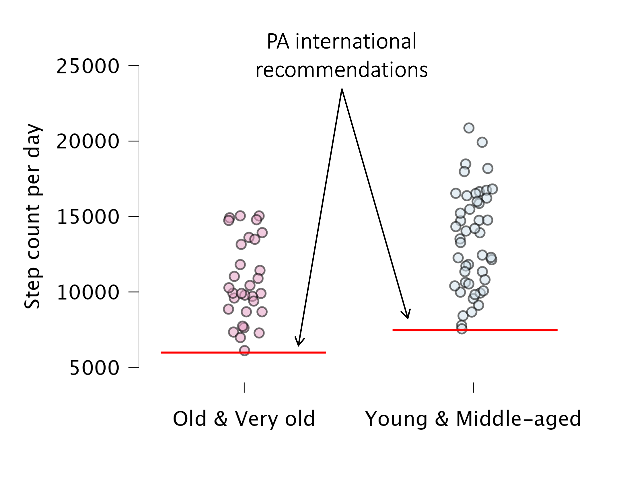 Figure 6 - International recommendations of physical activity (PA) in step count. The threshold for Old-Very old and Young-Middle-aged persons is set at 6000 and 7500 steps per day, respectively. In our sample, all participants met this criterion.
