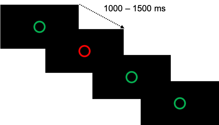 Figure 7 - Signals for the Go/NoGo task. The participants had to press the space bar of the keyboard as fast as possible in response to the Go trials (green circles) and to not respond in NoGo trials (red circles). The intervals between signals varied from 1000 ms to 1500 ms, with a maximal appearance duration of 2000 ms.