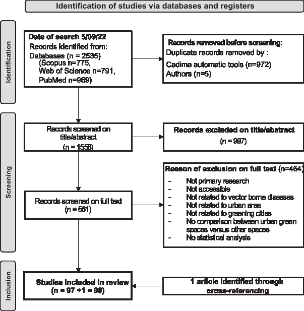 Mercat, M.; Bartholomee, C.; Fournet, F.; Alcover Amengual, M.; Bourquia, M.; Bouhsira, E.; Cornel, A.; Fernandez-Cassi, X.; Fontenille, D.; Ibanez-Justicia, A.; Marti, R.; Moiroux, N.; Niang, E. H.; Smith, W.; Spitzen, J.; Visser, T. M.; Koenraadt, C. J.M.; Simard, F. Green cities and the risk for vector-borne disease transmission for humans and animals: a scoping review. Peer Community Journal, Volume 5 (2025), article  no. e121. https://doi.org/10.24072/pcjournal.641