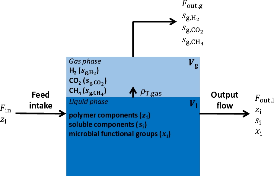 The feed intake constitutes the input flux of the system. The feed is degraded by the rumen microbiota, leading to the production of several components in liquid and gas phase. Polymer components, soluble components and microbial functional groups are the components in liquid phase, and hydrogen, carbon dioxide and CH4 are the components in gas phase. Chemical compounds leave the system in liquid and gas phases as shown in Figure 1.