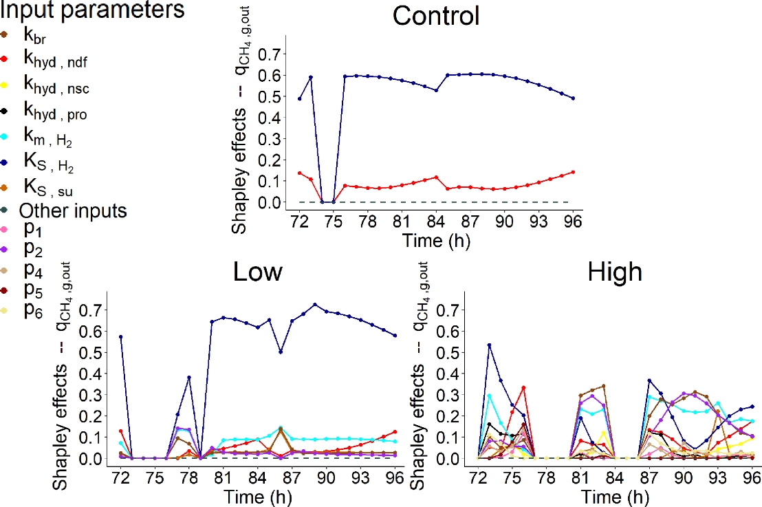 However, the range of variation of IPs explored in our study led to outlier simulation for AT treatments. For instance, an IP simulation scenario led to \(q_{{CH}_{4},g,out}\) values of 96 and 0.07 mol/h at t = 74 and 73h for low and high AT treatments, respectively. These outliers were not identified for the control. This suggests that some of the range of variation explored for \(K_{S,H_{2}}\), \(k_{m,H_{2}}\), \(p_{2}\) and \(k_{br}\) was not appropriate when considering AT treatments.