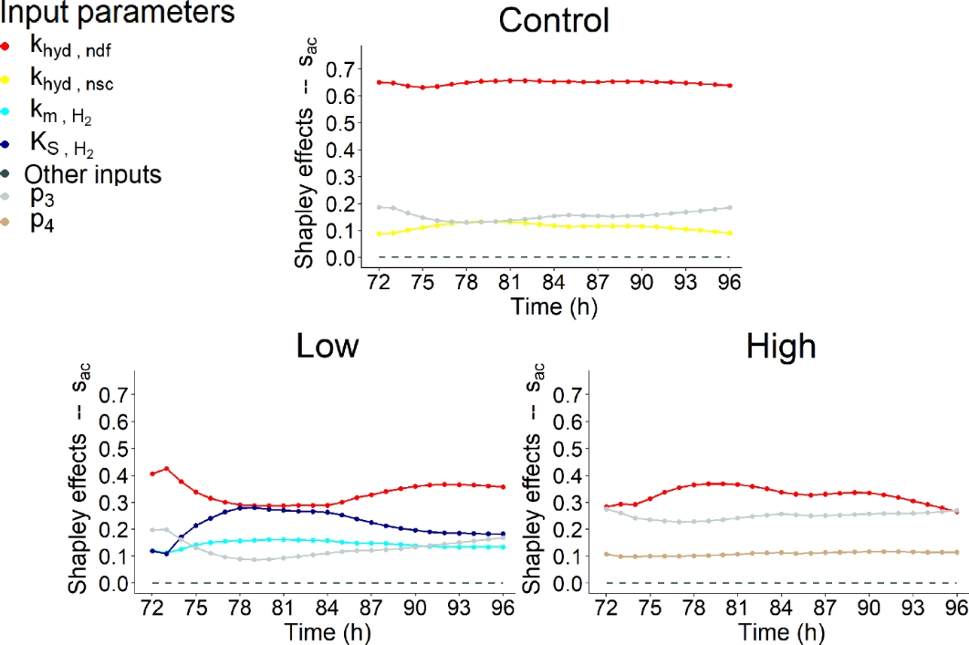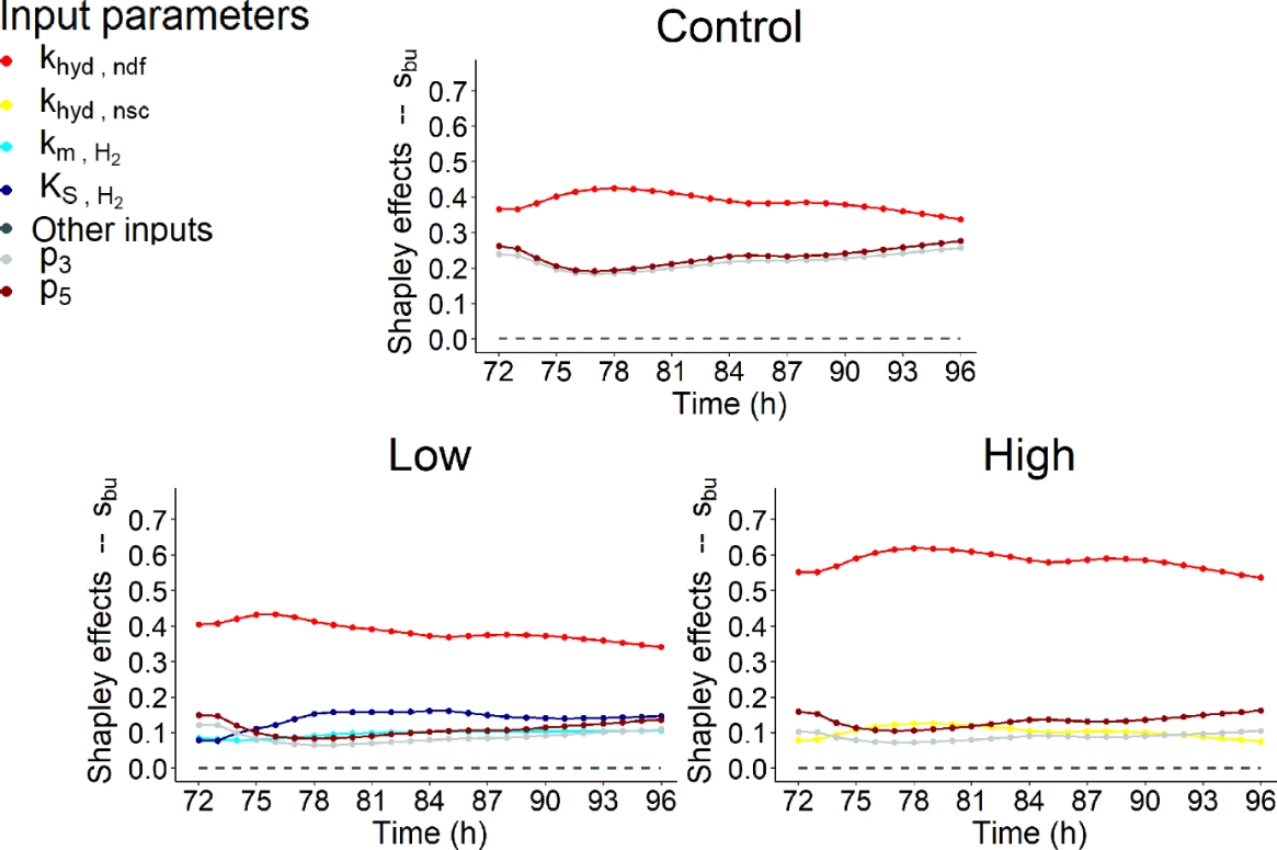 The SA method implemented was the Shapley effects (Owen, 2014). The added value of the Shapley effects is the consideration of the three effects of an input on an output. Here, this is an academic exercise, as no dependencies or correlations between parameters are present in the model studied, but using this type of methods is crucial in the future. By applying this SA method over time in a context considering the effect of a CH4 inhibitor, we are able to identify the parameters explaining the variation of CH4 and VFA, and to investigate how the contribution of these parameters move according to the inhibitor doses. These parameters are associated with different factors representative of different microbial pathways of the fermentation. Therefore, at the end, we are able to identify which factors/pathways contribute the most to CH4 and VFA variation, and to quantify these contributions. This can be useful, in addition to in vitro and in vivo studies, to know on which factors to play to reduce CH4 production.