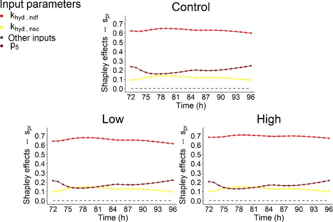 Figure 13 - Standard deviation of the simulations of rate of methane production in gas phase (\(q_{{CH}_{4},g,out}\), mol/h) over time (h) used to calculate the Shapley effects for the three dietary scenarios (control: 0% of Asparagopsis taxiformis, low treatment: 0.25% of Asparagopsis taxiformis and high treatment: 0.50% of Asparagopsis taxiformis).