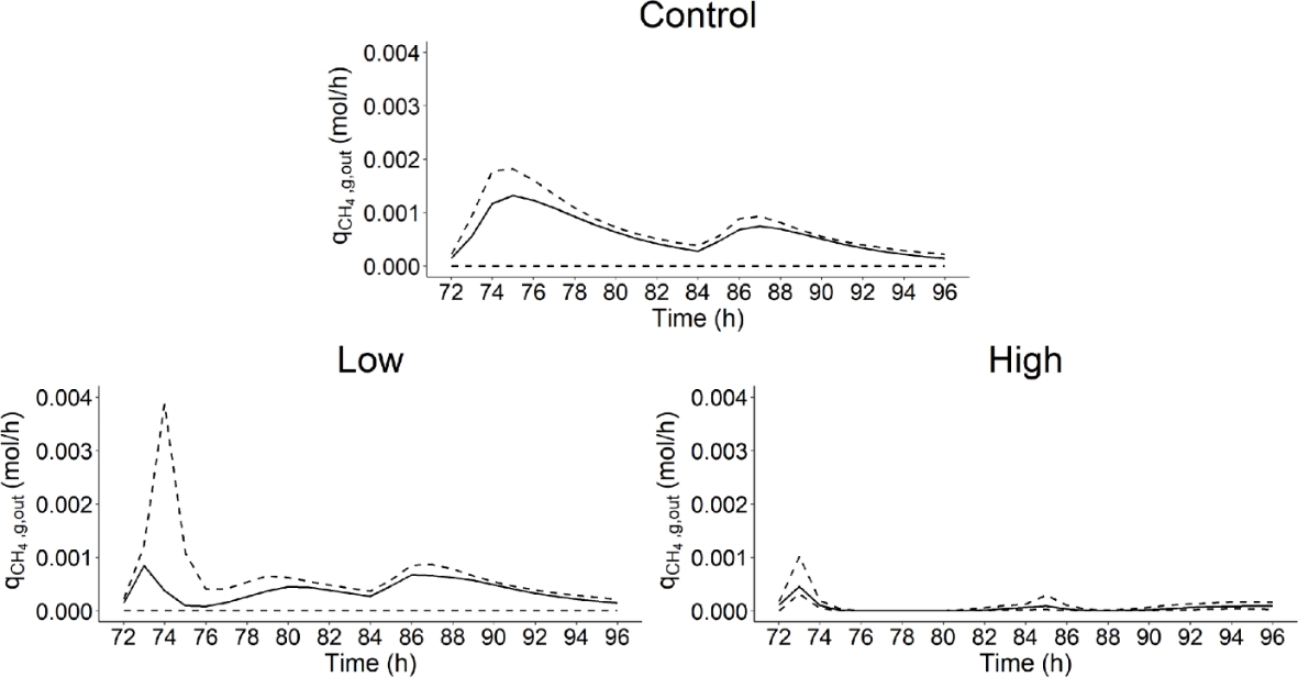 Moreover, Figure 13 highlighted that \(q_{{CH}_{4},g,out}\) variability varied over time and that this variability was related to the dynamic of DMI (g/h). The time periods associated with the highest intake activity (represented by the level of decay of the curve of Figure 2) were between 72 and 78h for the first feed distribution and 84 and 90h for the second feed distribution. The first feed distribution time period was systematically associated with the highest variability of \(q_{{CH}_{4},g,out}\) simulations with a maximum SD of 7e-04 mol/h at t = 75h, 6e-04 mol/h at t = 74h and 7e-05 mol/h at t = 73h for control, and low and high AT treatments, respectively. This feed distribution represented 70% of the total DM. The second feed distribution, representing 30% of the total DM, was also associated with an important variability of \(q_{{CH}_{4},g,out}\) simulations for the three dietary scenarios. Therefore, simulation variability increased during the high intake activity periods of both feed distributions and decreased at the end of it. These results go in line with model developments predicting CH4 with dynamic data DMI as single predictor (Muñoz-Tamayo et al., 2019, 2022).