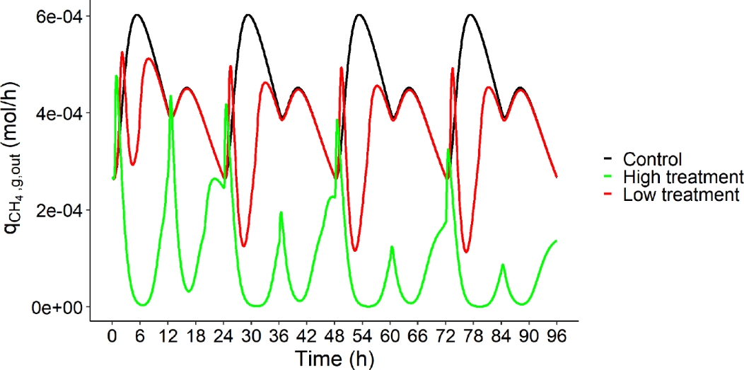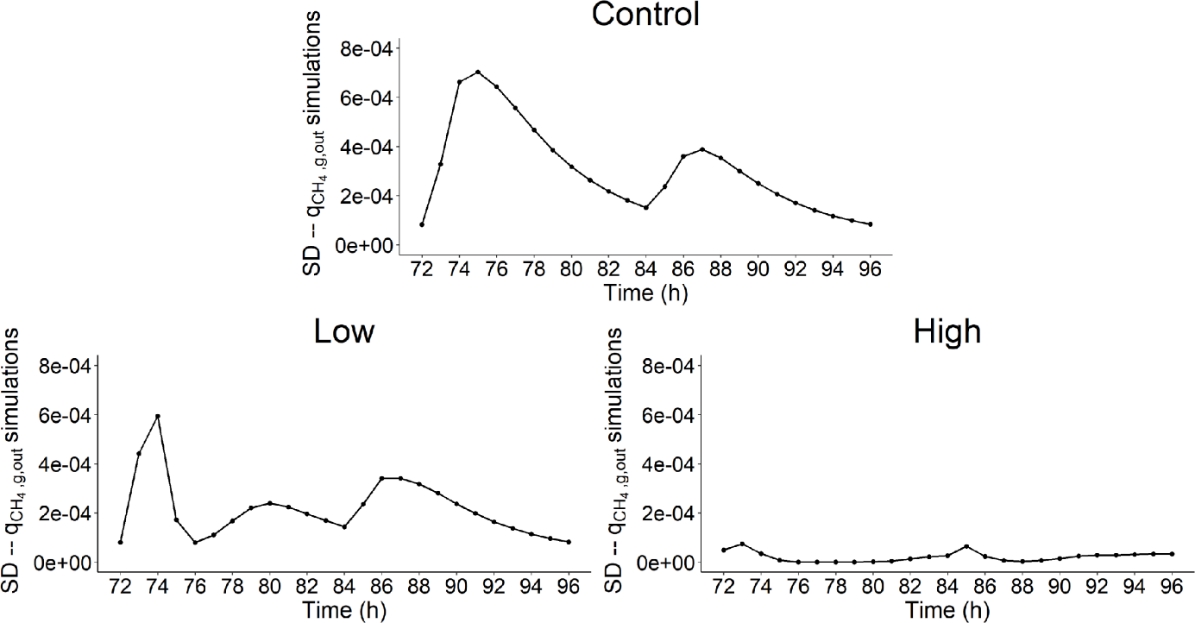 When not considering the 10% more extreme simulations, the CV highlighted that \(q_{{CH}_{4},g,out}\) simulations showed a lower variability for low and high AT treatments with a median CV of 0.74 and 0.59, respectively. Whereas, the control showed a median CV of 0.78.