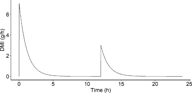 Where \({DM}_{total}\) is the total quantity of dry matter (DM) ingested in one day (g), \(\lambda_{n_{j}}\) is the fraction of \({DM}_{total}\) supplied in the distribution \(j\) and \(k\) (h-1) is the intake kinetic rate. \({DM}_{total}\) was set to 11.25 g supplied in two feed distributions (\(n_{r} = 2\)). We set the first feed distribution to account for 70% of the total DM (\(\lambda_{n_{1}} = 0.7\)). This configuration provides a DMI kinetics composed of two distributions with a significantly greater amount of DM ingested during the first intake and a medium intake kinetic (Figure 2).