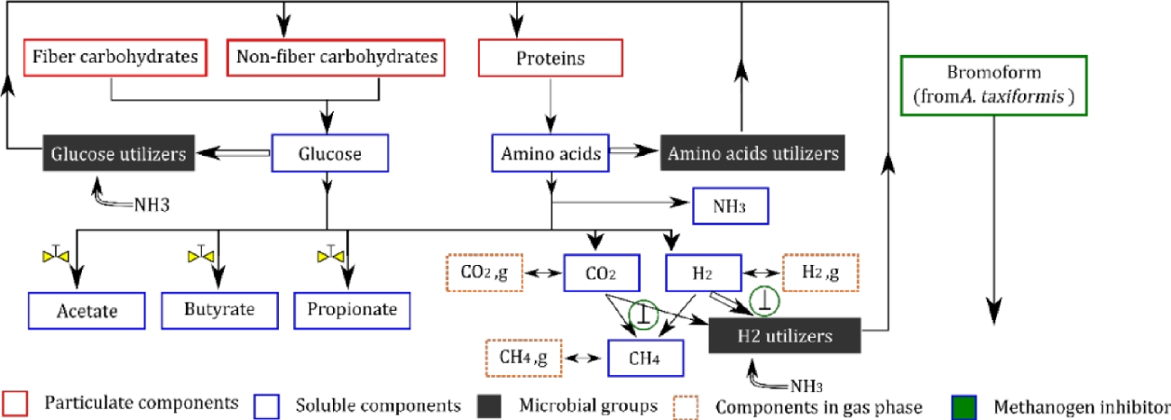 Figure 3 - Representation of the in vitro rumen fermentation from Muñoz-Tamayo et al., (2021) model. This conceptual representation is based on biochemical assumptions described in Muñoz-Tamayo et al. (2016; 2021). The main assumptions are: 1) three polymer components are considered in the rumen: fiber carbohydrates, non-fiber carbohydrates and proteins, 2) hydrolysis of polymer components releases glucose (for fibers and non-fibers) and amino acids (for proteins), constituting two of the three soluble limiting substrates available in the rumen. The last soluble limiting substrate available is hydrogen, 3) the rumen microbiota is represented by three microbial functional groups (glucose utilizers, amino acids utilizers and hydrogen utilizers) determined by the microbial utilization of the three soluble limiting substrates in the fermentation pathway, 4) the utilization of the soluble substrates by biological pathways is done towards two mechanisms: product formation (single arrows) and microbial growth (double arrows), 5) acetate, propionate and butyrate are the only volatile fatty acids produced from the fermentation and 6) methane, carbon dioxide and hydrogen are the gas outputs of the fermentation. The inclusion of bromoform as the inhibitor compound of AT impacted the fermentation via two mechanisms. First, the bromoform has a direct inhibition of the growth rate of methanogens, resulting in a CH4 production reduction and hydrogen accumulation (represented by ). Second, the bromoform affects indirectly, through the hydrogen accumulation, the flux allocation towards VFA production, as hydrogen exerts control on this component (Mosey, 1983) (represented by ).