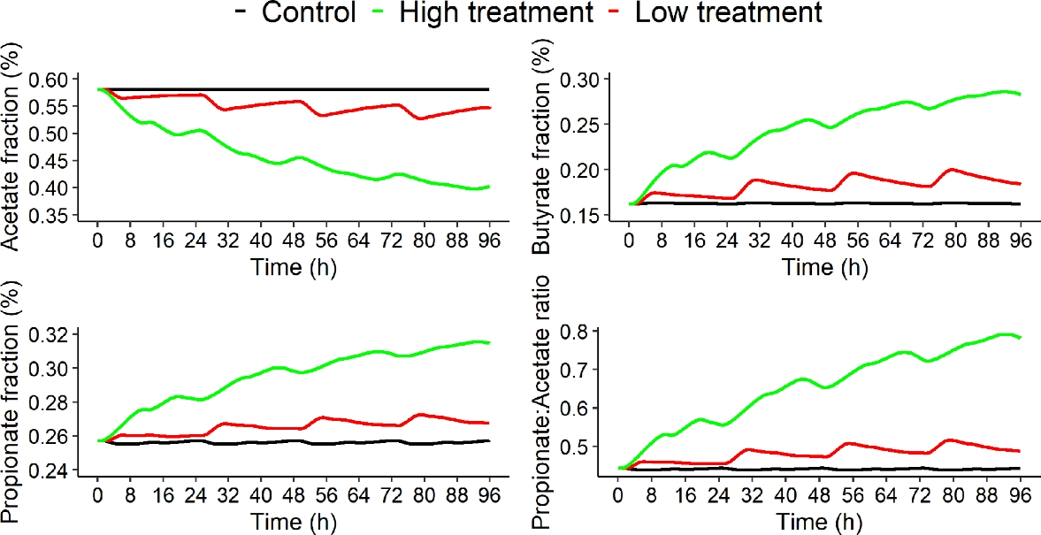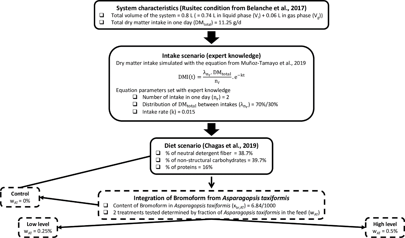 The consideration of feed intake (Figure 1) in the model studied allows to simulate dietary scenarios. In the system, the feed intake is composed of one intake scenario, which defines the intake dynamic, and one diet scenario, which defines the diet composition. The intake scenario is simulated before running the model by computing Equation 1 setting parameters with expert knowledge, conducting to Figure 2. Whereas, the diet scenario is set when computing the input flux \(F_{i,in}\) associated with the three polymer components (Equation 2, presented later). The fractions of fiber carbohydrates, non-fiber carbohydrates and proteins in the diet (\(w_{ndf}\), \(w_{nsc}\), \(w_{pro}\)) were set using data from an in vitro study assessing several dietary CH4 mitigation strategies, including AT, on the fermentation (Chagas et al., 2019). This experiment tested the impact on CH4 production of several doses of AT from 0 to 1% DM (containing 6.84 mg/g dry weight of bromoform) in the diet. The diet was composed of 38.7% DM of neutral detergent fiber (\(w_{ndf}\)), 39.7% DM of non-structural carbohydrates (\(w_{nsc}\)) and 16% DM of crude proteins (\(w_{pro}\)). We analyzed three simulation scenarios: A control treatment with 0% of AT, a low treatment with 0.25% of AT and a high treatment with 0.50% of AT (Figure 4).