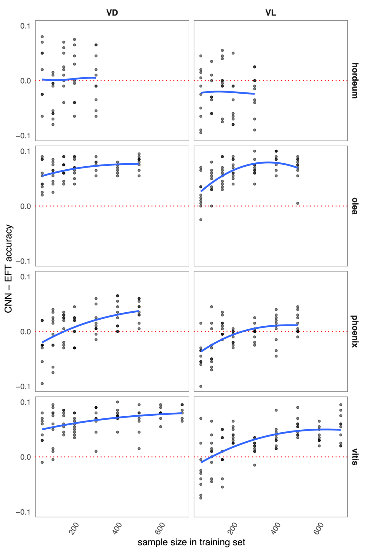 Figure 3 - Model performances for each dataset training sample sizes and replicates, presented as absolute CNN - EFT accuracies. Sample sizes are expressed as the total number of images used per class (training/validation + evaluation). The models are run for the ventral (VD) and lateral (VL) views. Two-row vs six-row barley (hordeum) are compared, as well as the wild and domestic forms of olive (olea), date palm (phoenix) and grapevine (vitis).