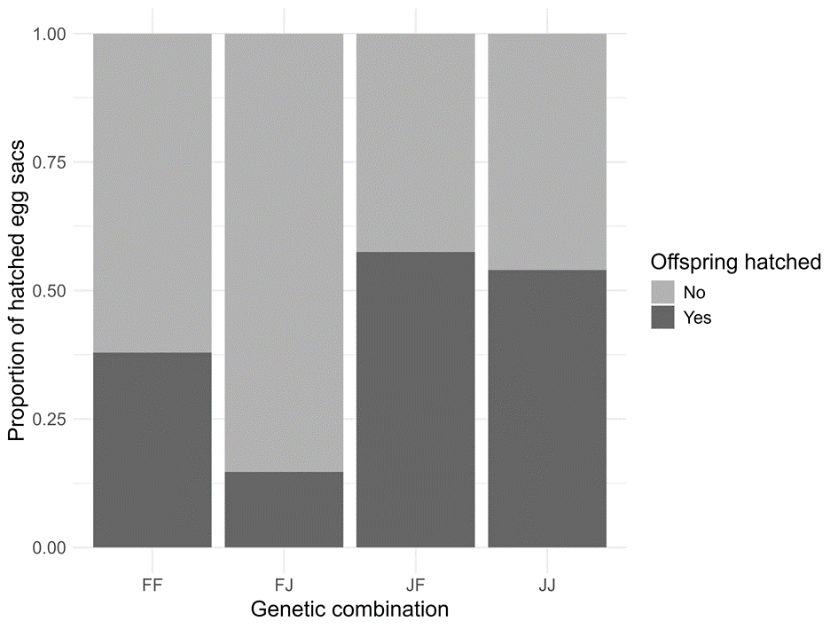 Table 1 - Number of egg sacs produced by each of the four parental groups (FF: Mediterranean mother/Mediterranean father, FJ: Mediterranean mother/Asian father, JF: Asian mother/Mediterranean father, JJ: Asian mother/Asian father).