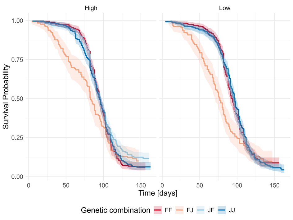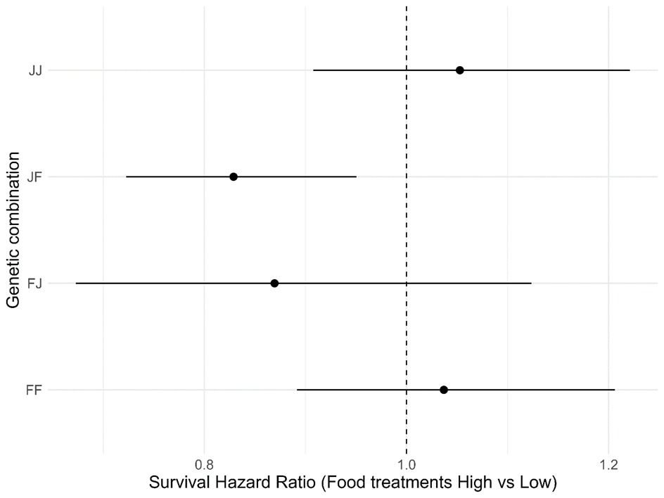 Appendix 3 - Hazard ratios for the effect of the food treatments (High, Low) on the survival of the four genetic combinations (FF, FJ, JF, JJ). A significant effect is visible for JF, which survived longer under high than under low food conditions.