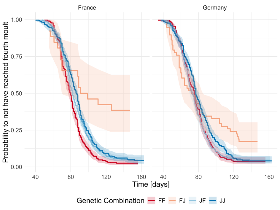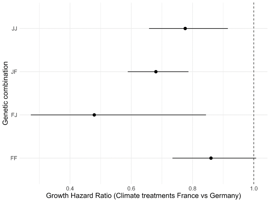 Appendix 4 - Hazard ratios for the effect of the climate treatments (France, Germany) on the growth of the four genetic combinations (FF, FJ, JF, JJ). Significant effects are visible for the backgrounds FJ, JF, and JJ, which grew faster in German than in French climate.