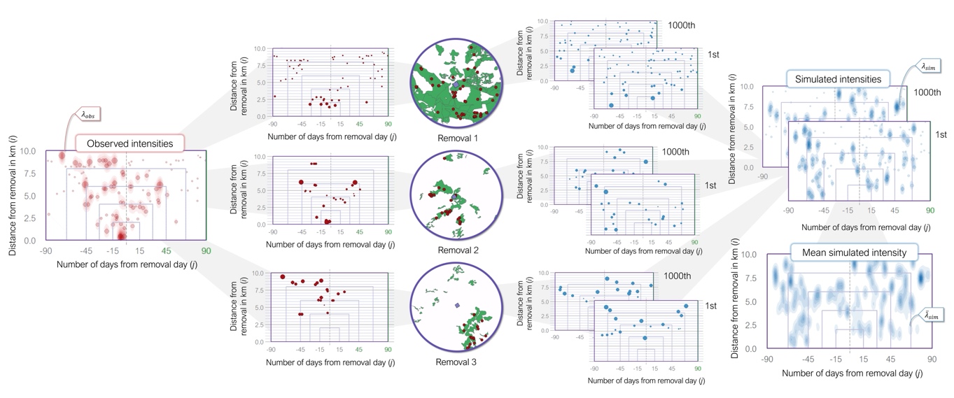 Figure 2 - Example of the spatio-temporal distributions of attacks around three lethal removals. The circles in the center show the spatial distribution of observed attacks (red points) within the pastoral units (green polygons) 10 km from the removal location (purple points). The intermediate graphs show the distributions of the observed attacks (left) and of two sets of simulated attacks (right) around removals along a unique spatial axis (i) and temporal axis (j). The size of points represents the spatial correction (see Supplementary Information S2). The observed and simulated attack intensities λobs and λsim on the sides are calculated by aggregating the observed attacks and the simulated sets of attacks, respectively. The mean simulated attack intensities \({\overline{\lambda}}_{\text{sim}}\) are eventually calculated by averaging λsim(i, j) of all simulated sets (here only two for the example). Rectangles delimit the five nested scales for trend computations: 15, 30, 45, 67 & 90 days and 0, 2, 4, 6, 8 & 10 km.