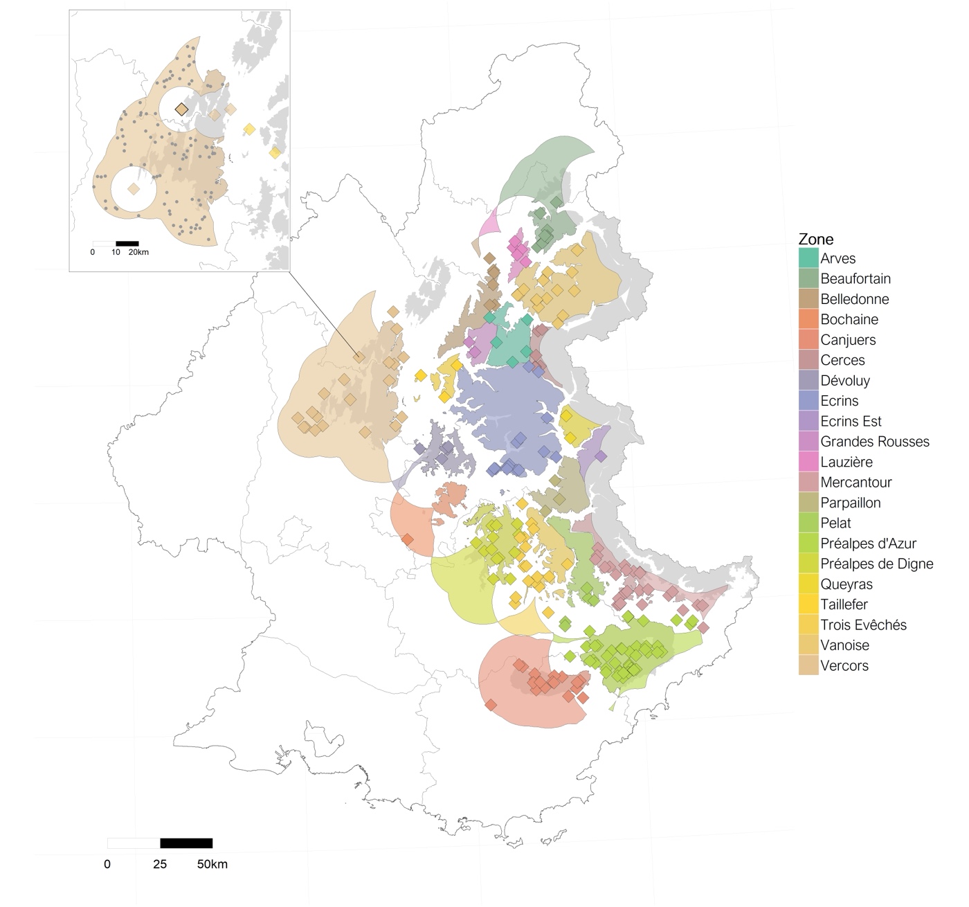 Our third test was made by dividing the dataset of single removals according to removal location. We selected the 8 zones with at least 10 removals (Figure 4): PNRPA (n = 33), Mercantour (23), Vercors (18), Trois-Evêchés (18), Vanoise (15), Préalpes de Digne (12), Ecrins (12) and Canjuers (11).