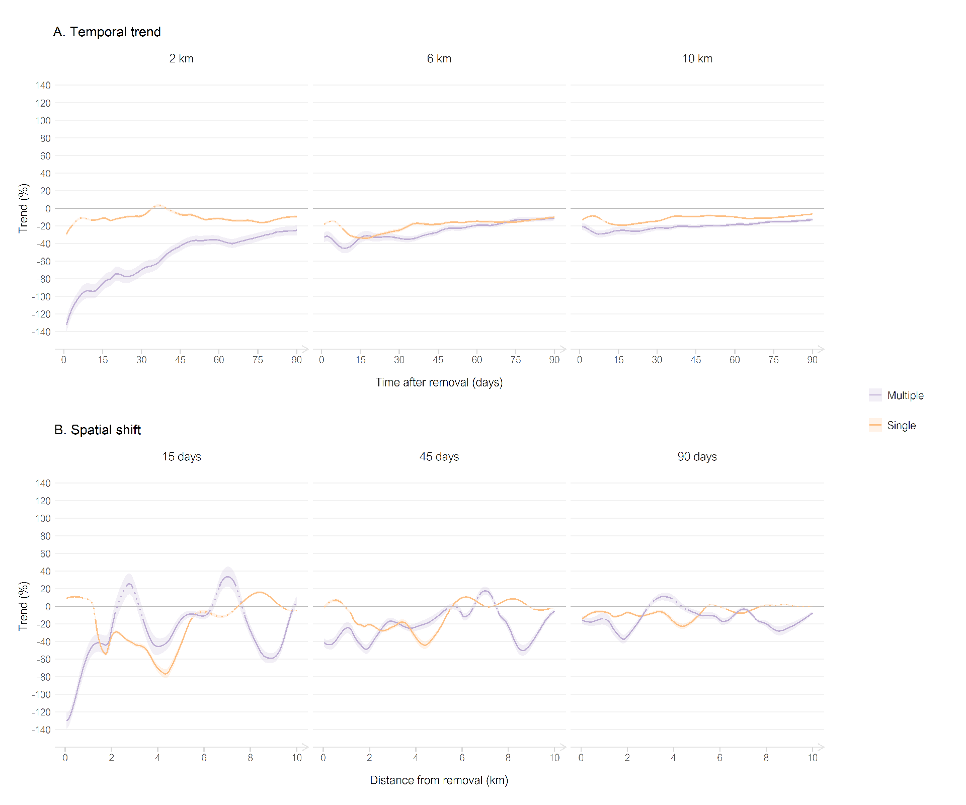 Figure 7 - Trends of attack intensities after the applications of single removals (orange) and of multiple removals (purple), alongside continuous temporal (A) and spatial (B) scales, for three fixed distances and periods, respectively. Lines are mean estimates, ribbons are the confidence intervals (range 83.4–90.4%). Dotted lines are not significant trends. Trends were corrected for livestock presence. Note that temporal trends are calculated as nested periods (e.g. from 0 to x days, over 0–2 km for first panel), while spatial shifts are trends calculated for specific distances (e.g. at the xth km, over 15 days for first panel).
