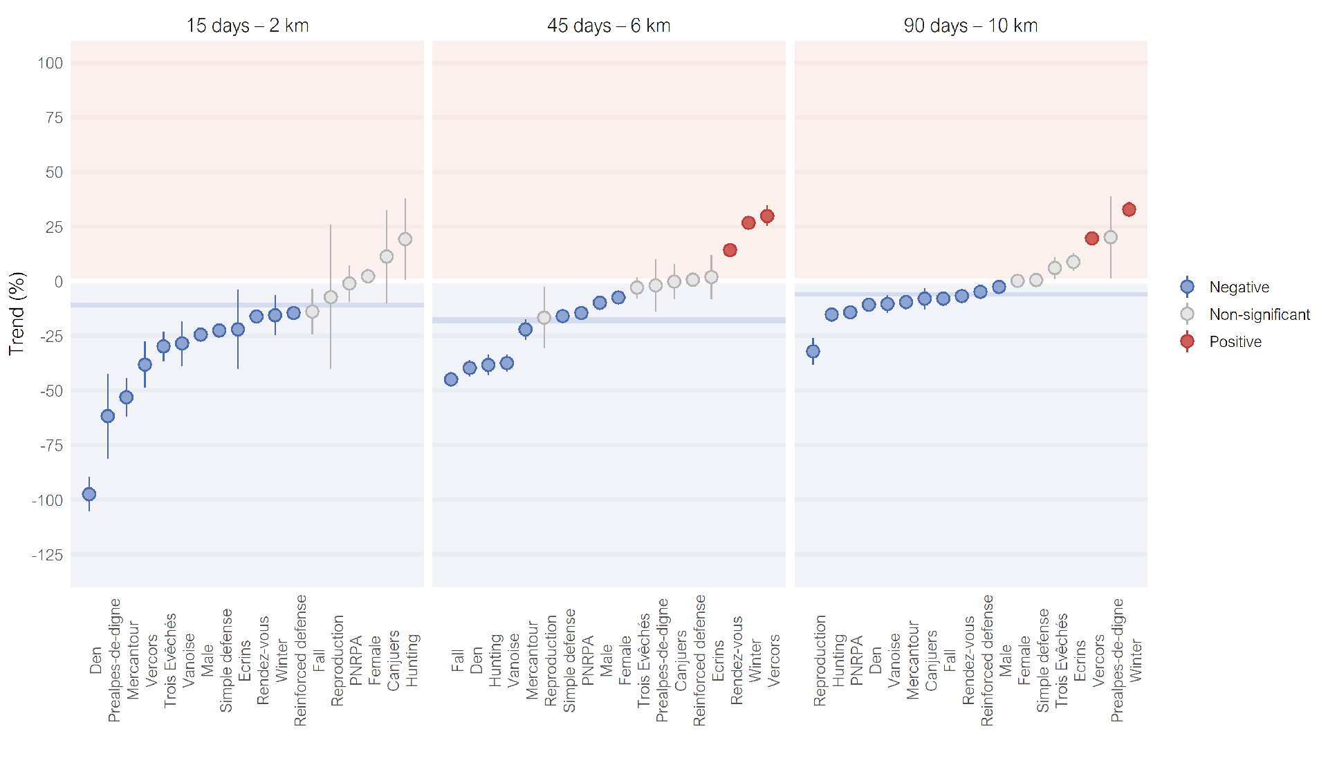 Figure 8 - Distributions of the trends of attack intensities for the 18 subsets of single removals at three nested scales. Points are mean estimates, alongside the confidence intervals (range 83.4–89.8%). Trends in grey are not significant. Trends were corrected for livestock presence. Confidence intervals of the entire dataset of single removals are in background in dark blue.