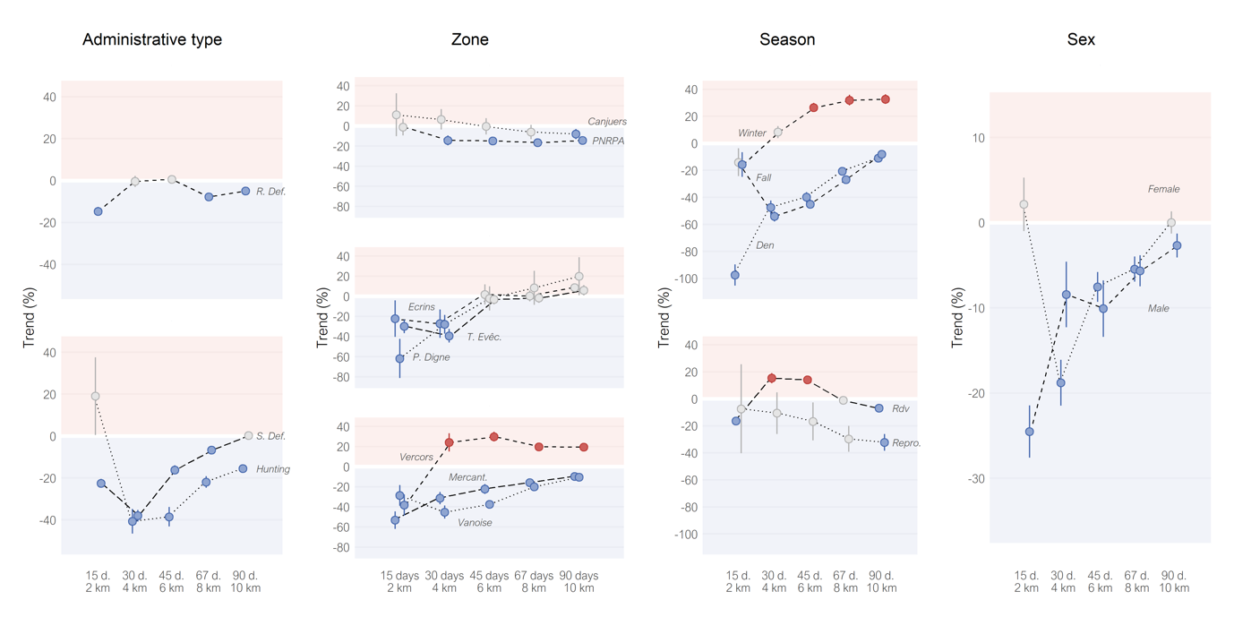 The main effect of moderate decrease of single removals concealed disparities between single removals. When dividing this large dataset according to removal’s location, removal’s season, removal’s administrative type or the sex of the killed wolf, we could observe very different trend profiles across the subsets (Figures 8, 9).