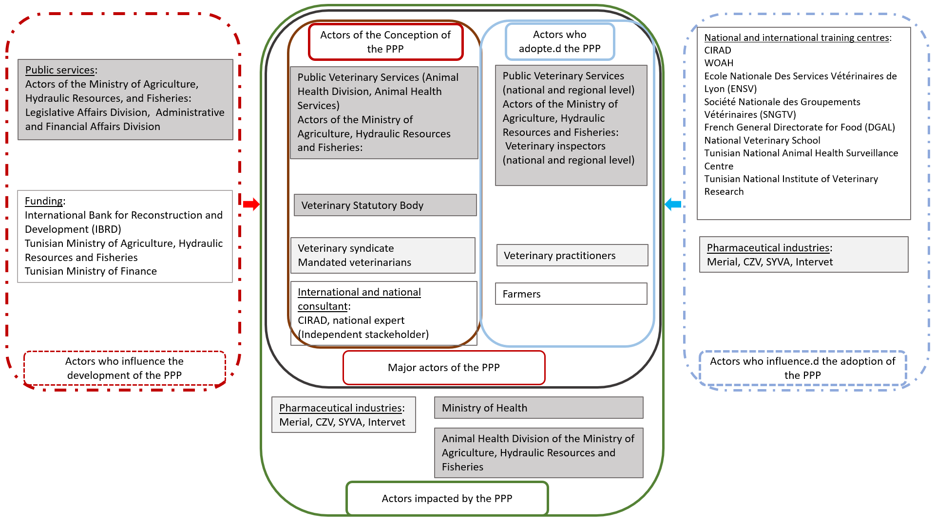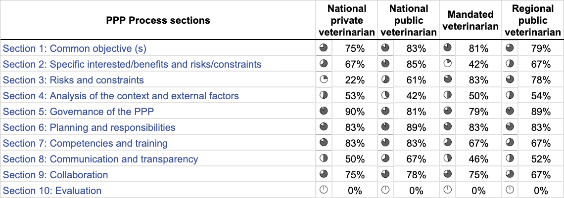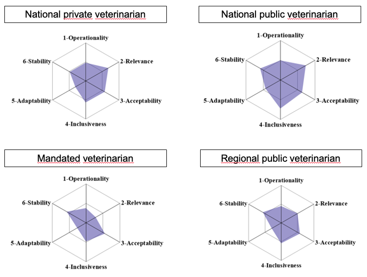 Over the past two decades, methodologies have been developed for integrated evaluation in the veterinary domain (Hendrikx et al., 2011; Goutard et al., 2015; Bordier et al., 2019; Peyre et al., 2022). These frameworks included focus on mechanisms for coordination and collaboration between stakeholders (Bordier et al., 2022). In 2021, Poupaud et al. developped a tool for assessing the quality of a PPP process in the veterinary domain. This tool allows a precise description of a PPP’s functioning, an analysis of its strengths and weaknesses, and an analysis on how the PPP process influences its performance.