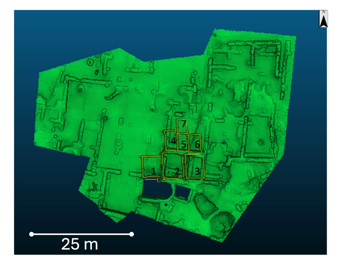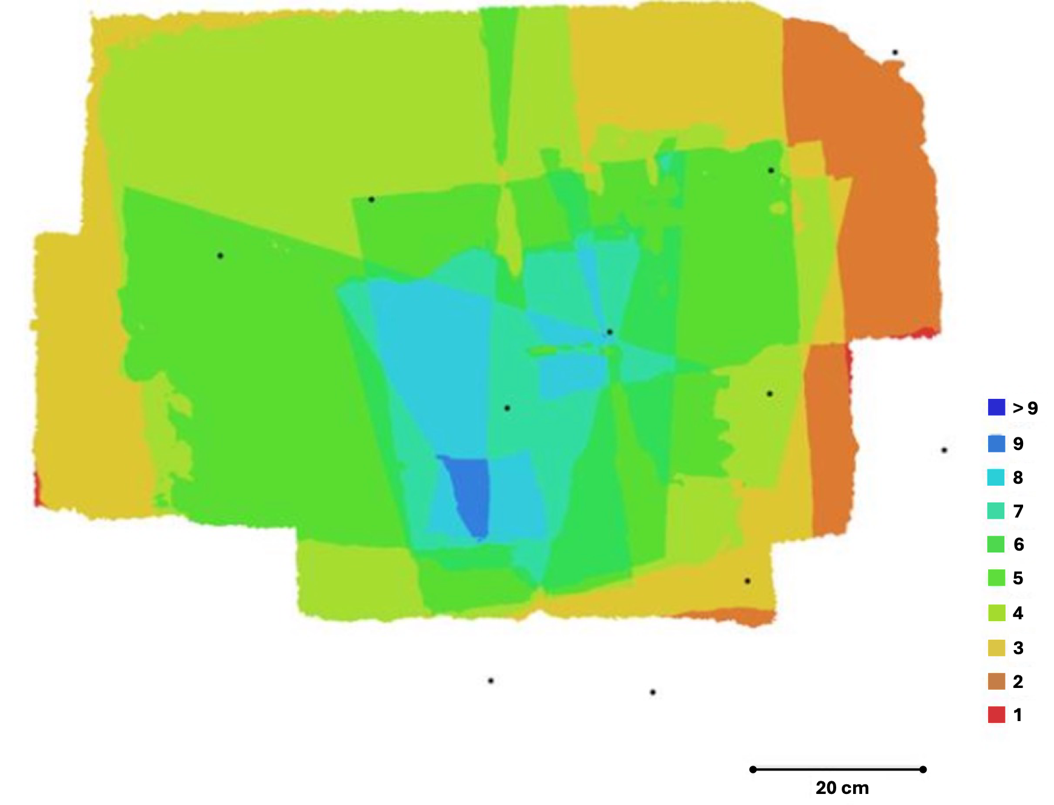 The present work builds upon a previously published study by Panagiotopoulou et al. (2023), expanding the scope of analysis and introducing new experimental findings. The motivation for these new experiments comes from a detailed map, shown in Figure 1, which illustrates the spatial distribution and overlap of historical photographs from the 1972 archival data. This map highlights that the central south portions of the Omega House have the highest density of overlapping photographic coverage, suggesting a lower level of geometric disparity between the 1972 and 2017 models in these areas. Consequently, the central south sections of the Omega House are the focus of the current investigation. By focusing on this region, which shows the smallest differences between the old and new models, we aim to perform a more detailed and accurate analysis of structural changes and stability. The east and northeast parts have the least overlap in historical photographs and result in a greater disparity in measurements between the two sets of models. The central south portions of Omega house which have been selected for investigation in the current study are demonstrated in Figure 2.