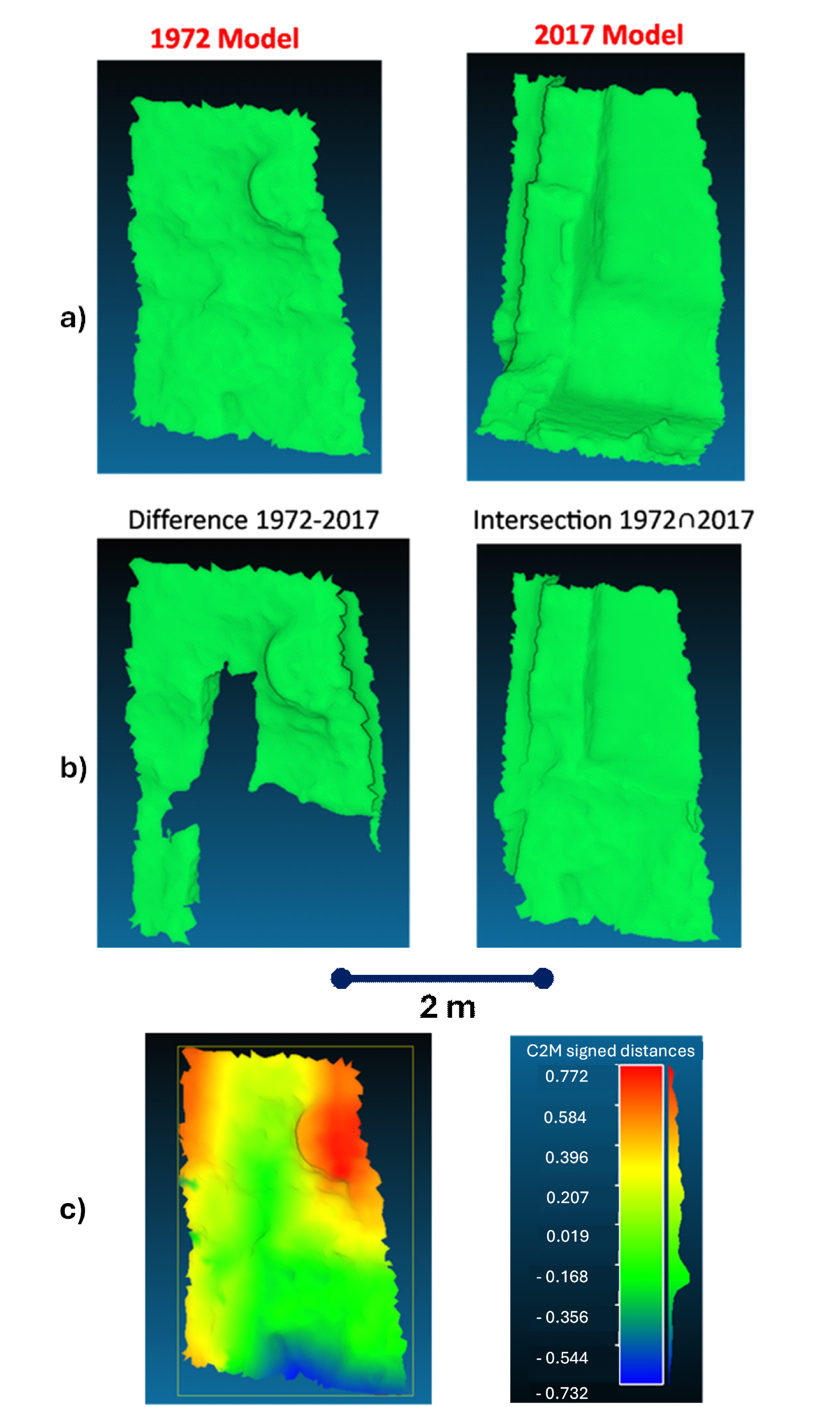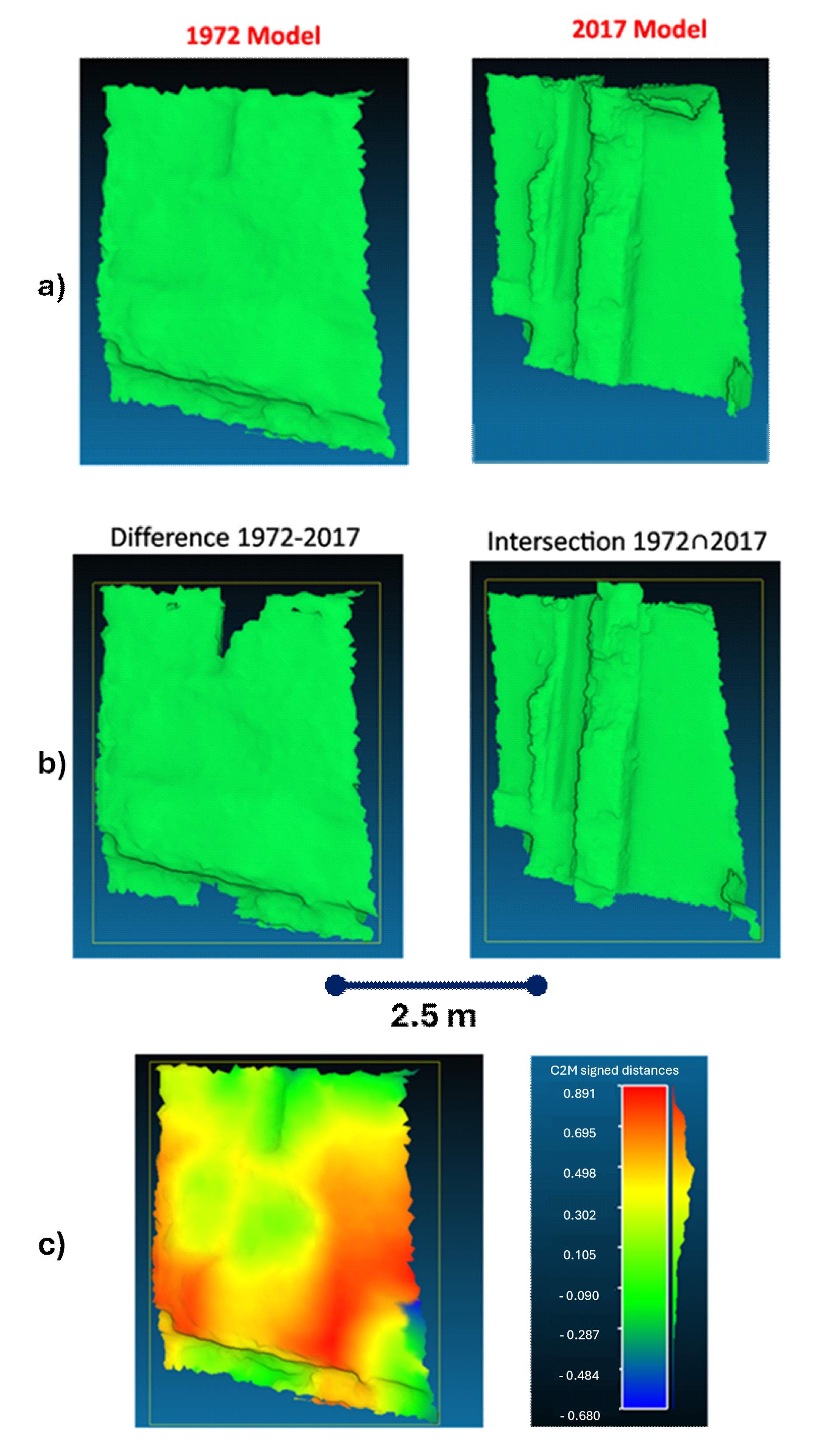 Figure 4 - a) Selected part 4 of Omega House b) The Boolean operations on the models Difference 1972-2017 and Intersection 1972∩2017 c) C2M signed distances in cm with reference the model 2017.