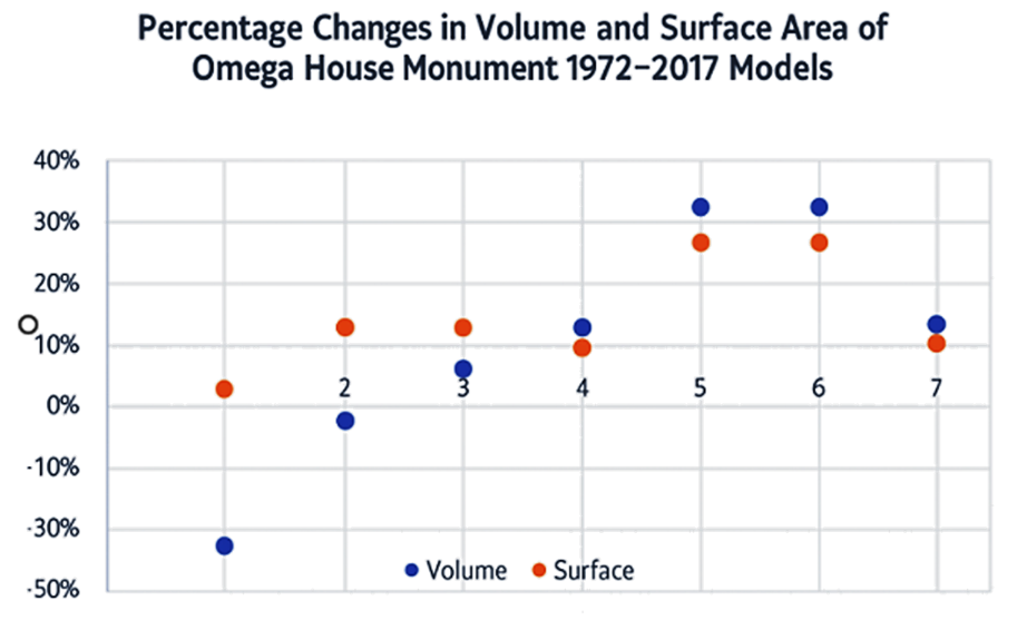 The scatter plot in Figure 5 illustrates the percentage changes in volume and surface area for the seven selected parts of the Omega House monument between the 1972 and 2017 models. The blue markers indicate the percentage change in volume, while the orange markers represent the percentage change in surface area.